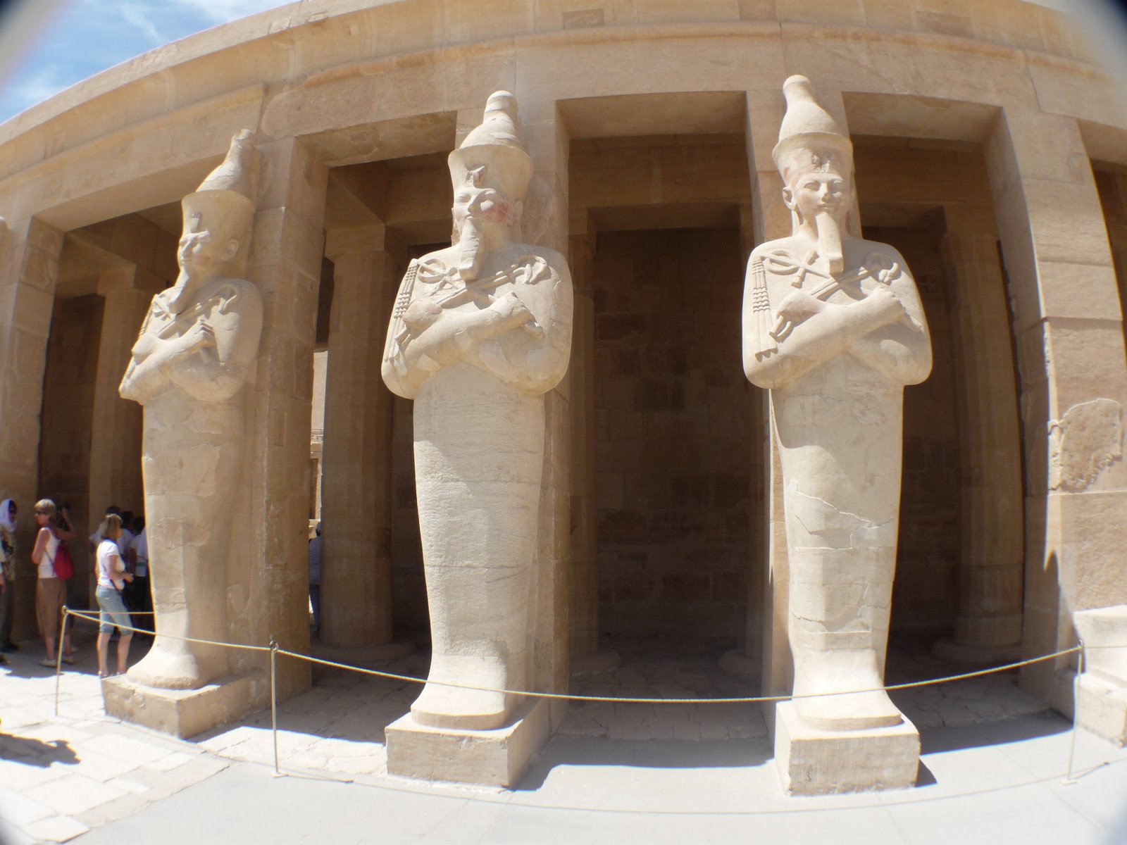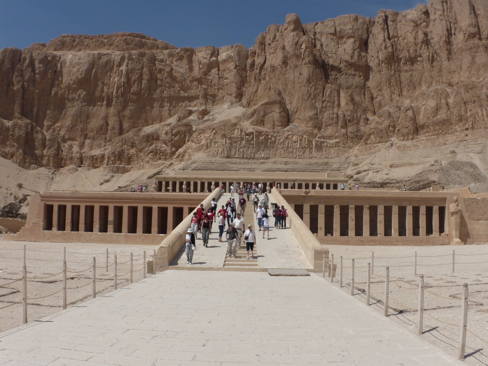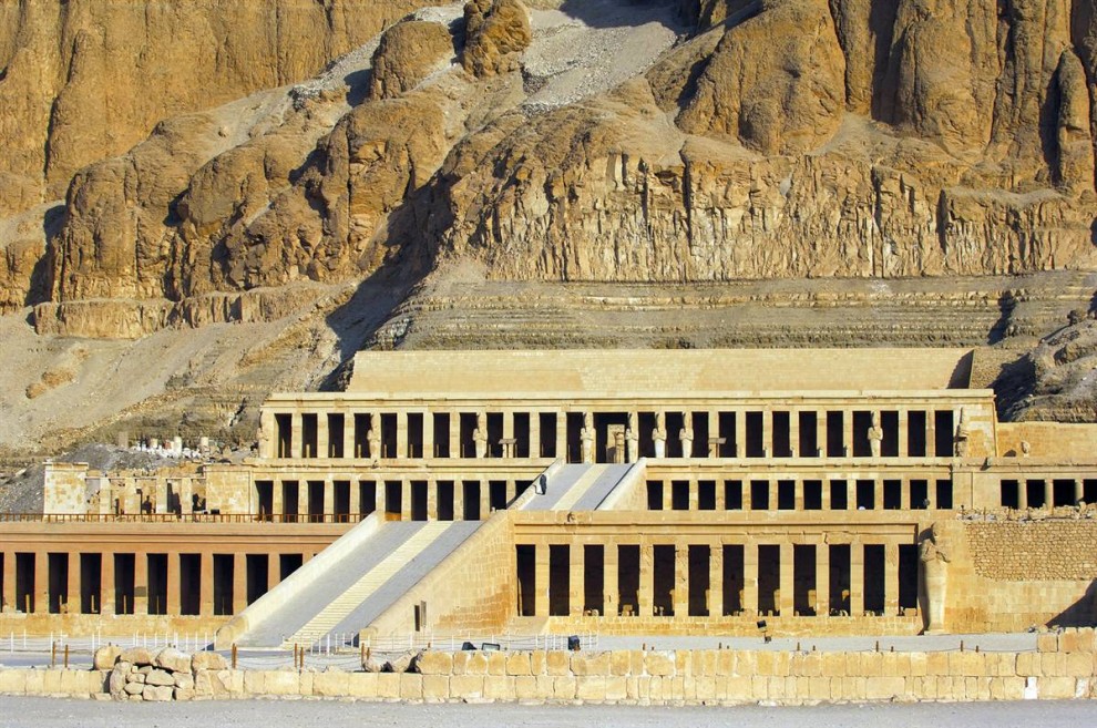 Заупокойный храм царицы Хатшепсут расположен у самого подножия скал. Его отличают чёткость архитектурных форм и красота пропорций. По архитектуре храм очень необычен и не похож на других храмы Древнего Египта. Три открытые террасы с колоннадами придают ему лёгкость. По наклонной рампе можно прогуляться к верхней террасе храма. А нависающая скала эфф