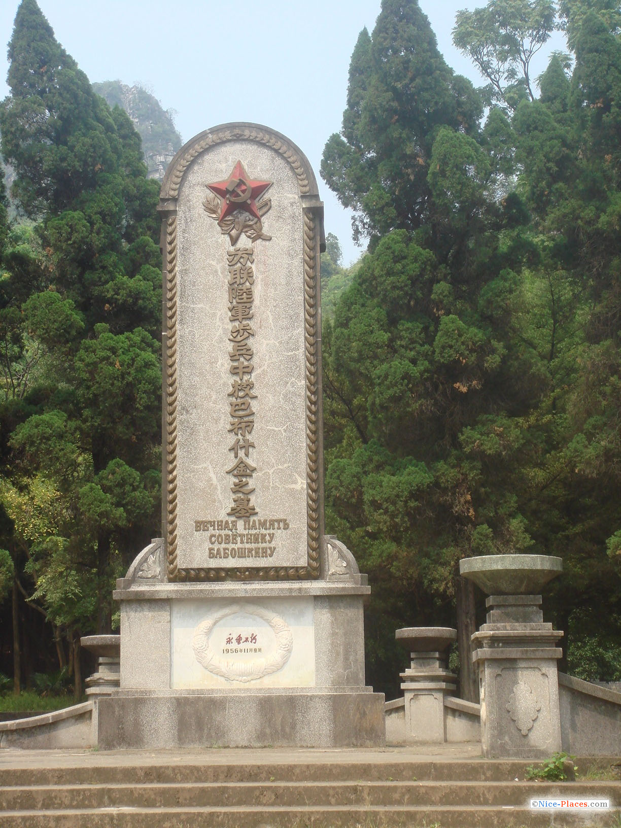 После сырых пещер нам захотелось забраться повыше. Как всегда в Китае, на вершину горы ведут ступеньки. Около 20 минут подъема и еще неделю болящие ноги того несомненно стоят! Вид на город, окруженный горами, и горы везде, куда хватает глаз... Непередаваемо. Впервые в жизни фотоаппарат не может охватить всю красоту. Спустившись с горы с другой стороны, наталкиваемся на памятник некоему советнику Бабошкину, воевавшему на Японско-Китайской войне.