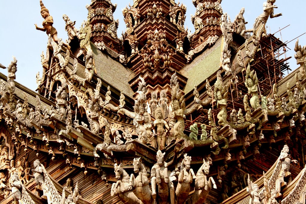Знакомство с историей и культурой жителей Паттайи можно начать с посещения удивительного Храма Истины с довольно необычной архитектурой, он расположен в черте города, прямо на берегу моря, а издали напоминает старинный корабль, вот-вот готовый отправиться в дальнее путешествие. Высота храма составляет 108 метров, он посвящен всем стихиям, согласно тайской философии, олицетворяющим собой мироздание – Огню и Воздуху, Земле и Воде. Посещение храма можно совместить с просмотром уникального шоу дельфинов, которое входит в стоимость экскурсии.