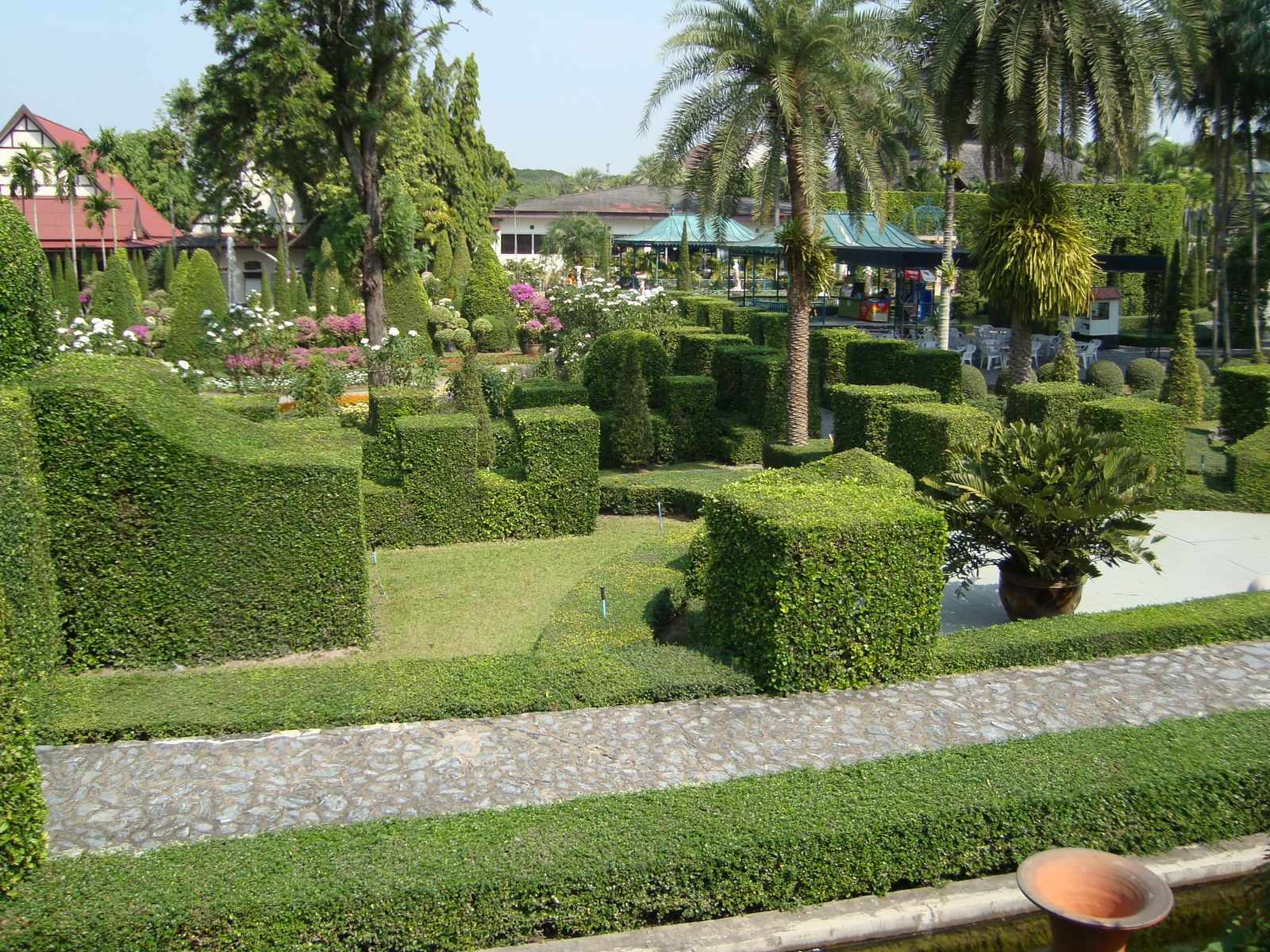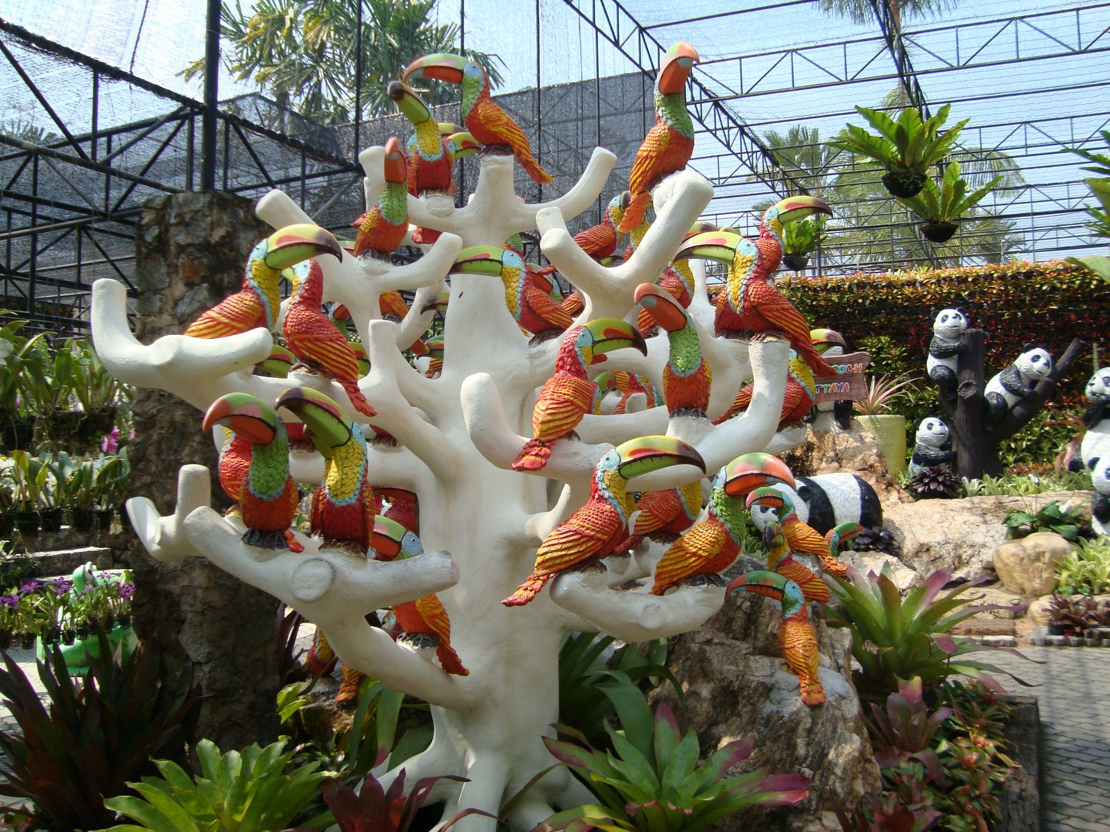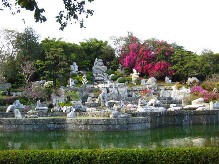 Составной частью тропического парка является и Голубой сад, на территории которого посажено более 1000 разновидностей пальм, собранных со всего мира, а также влаголюбивых папоротников, представлены и цветочные горшки различных конфигураций, и французские ландшафты, гармонично сочетающиеся с необычными тайскими постройками в этническом стиле. На территории парка также находится и миниатюрная модель английского Стоунхеджа. Особый интерес вызывают садик птиц и слоновая ферма, где можно увидеть грандиозное шоу, покататься на слоне по местным джунглям или посмотреть петушиные бои, а также стилизованную борьбу на мечах и национальные тайские танцы. Здесь же расположен и зоопарк – один из самых крупных зоопарков региона, в котором можно ознакомиться с разнообразием фауны Азии, в том числе и с вымирающими видами, которые уже почти не встретить в дикой природе.