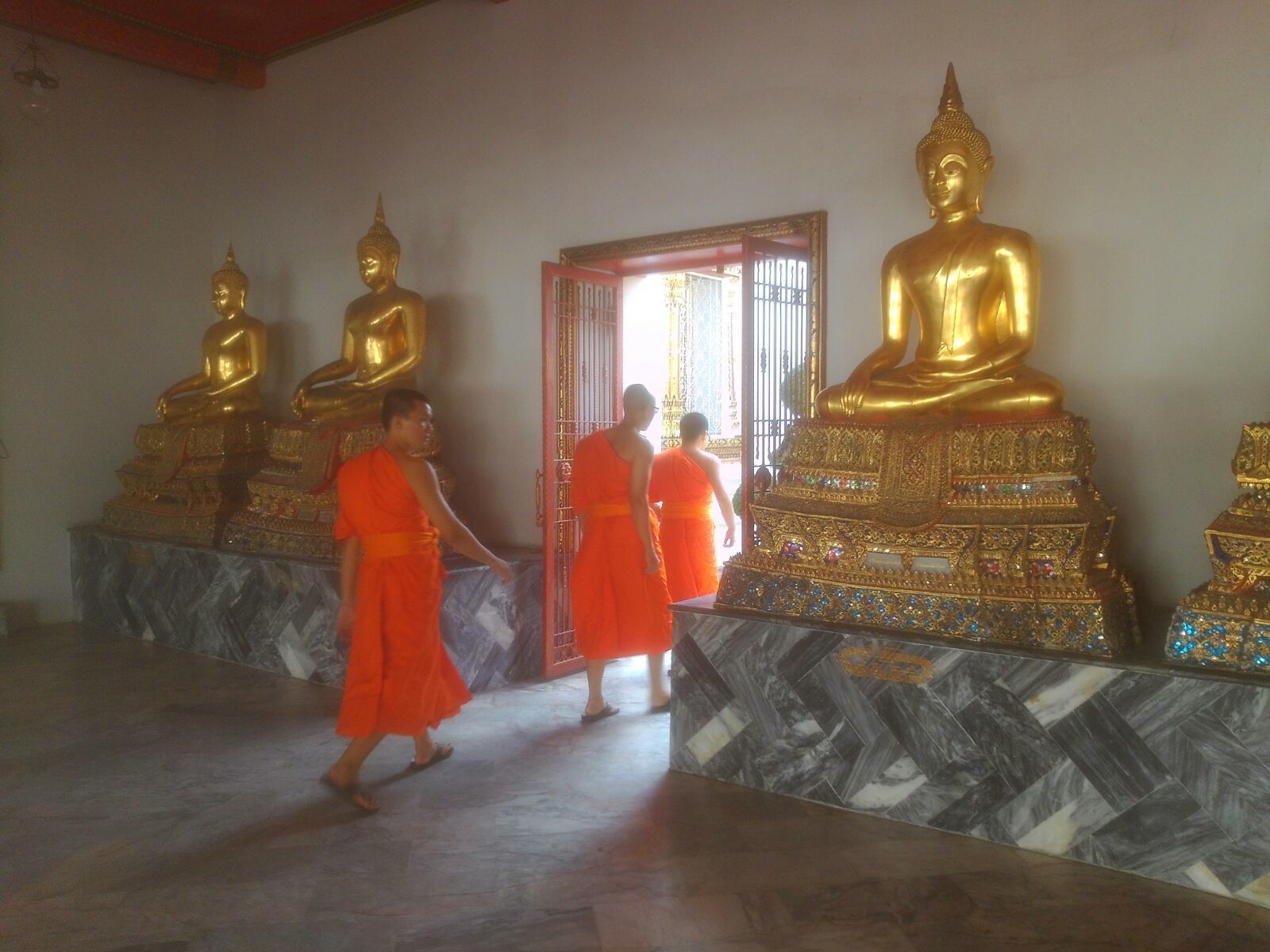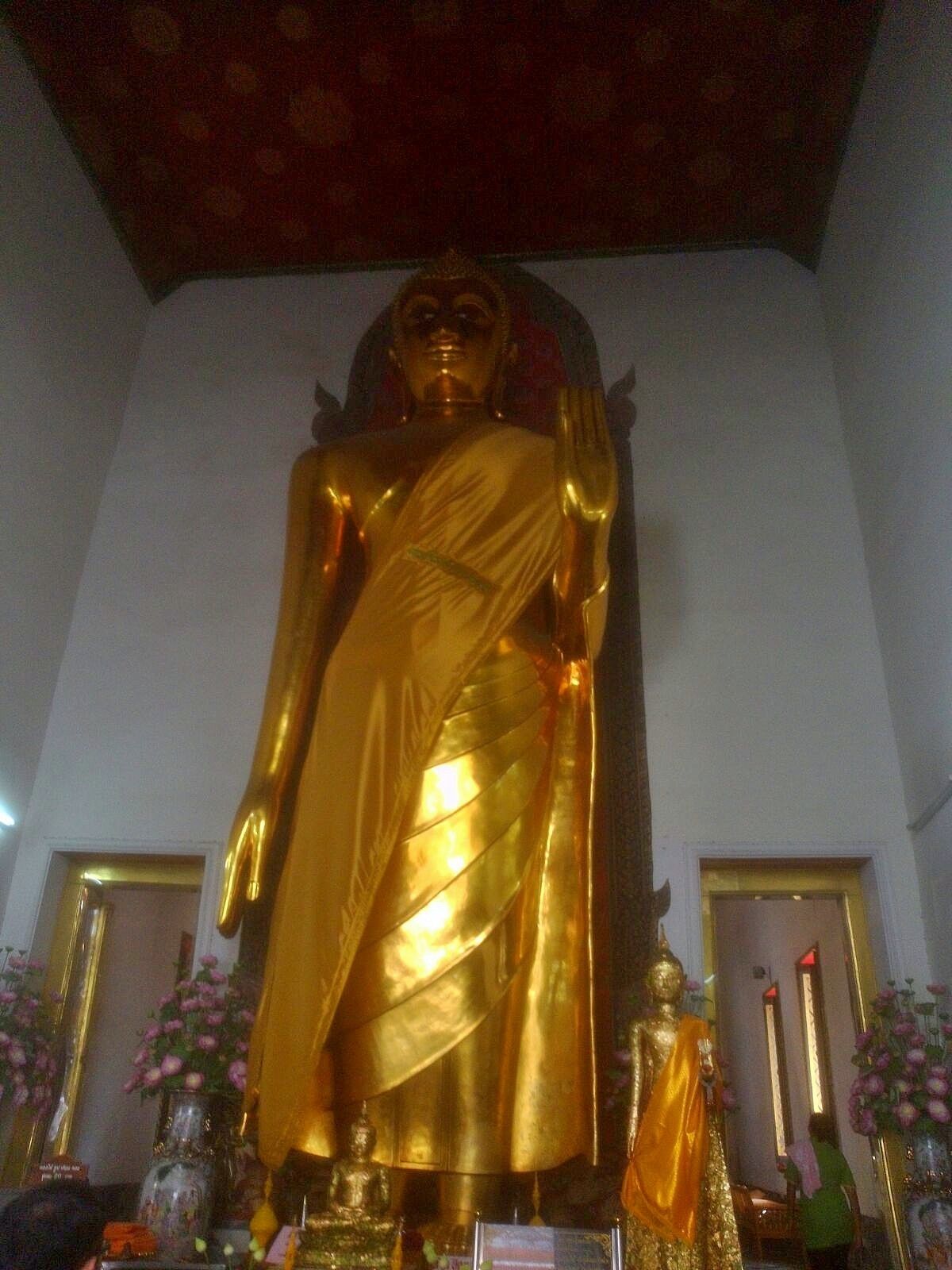 Первая наша остановка будет у храма Ват Траймит (Wat Trimit), более известного как храм Золотого Будды. В нём находится самая большая золотая статуя Будды в мире, высотой около 3 метров и весом в 5,5 тонн чистого золота. Долгое время ни кто из местных жителей даже не подозревал, какое сокровище находится под слоем гипса, пока в один из дней во время транспортировки статуя не попала под дождь который смыл часть защитного покрытия. Монахи, заметившие странный блеск, к своему удивлению обнаружили, что статуя была сделана из чистого золота.