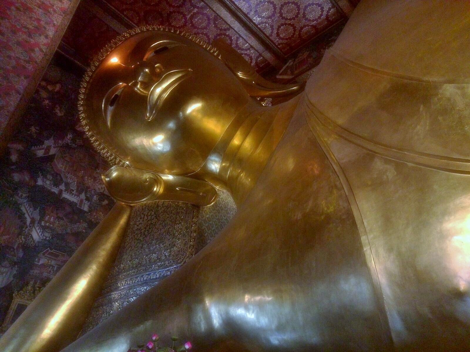 Миновав китайский кварта «чайнатаун» где находится храм Золотого Будды, мы остановимся у одного из старейших храмов под названием Ват Пхо (Wat Pho), известного как храм лежащего Будды. Здесь находится одна из самых больших статуй в Бангкоке, длиной в 46 метров и высотой 15 метров, которая иллюстрирует прохождение Будды в нирвану. Посетители традиционно оставляют здесь монеты в специальных сосудах, расположенных у стены позади Будды, и потом загадывают своё сокровенное желание. Надеюсь что ваше желание обязательно сбудется и вы снова сюда вернетесь!