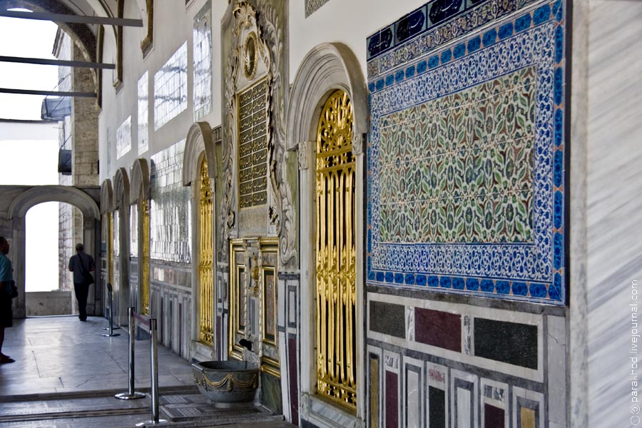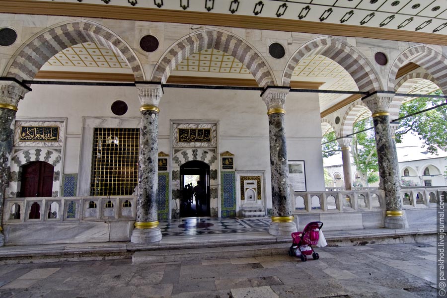 Чтобы представить себе богатство султанской казны, хорошо бы зайти во Внутреннюю кладовую – в этом месте хранились все собранные налоги и подати. Верующие люди обязательно должны посетить Павильон святого покрова, здесь в стеклянном шкафу хранится одна из мусульманских святынь – волосы с бороды и зуб пророка Мухаммеда. Кстати, в замке хранятся и христианские святыни. В четвёртом зале сокровищницы дворца возле трона находится шкаф, а в шкафу шкатулка, а в шкатулке… Экскурсоводы Вам скажут, что в шкатулке хранится кисть Иоанна Крестителя. Таких мест с уникальными реликвиями святых в мире достаточно много, иногда даже бывают даже совпадения. В Турции, например, под Колонной Константина по легенде закопаны топор Ноя, сосуд Марии Магдалены и прочее. Радует, что внимательные люди прошлого сохранили для нас подобные реликвии. Видимо аукционы с вещами знаменитостей проводились во все времена.