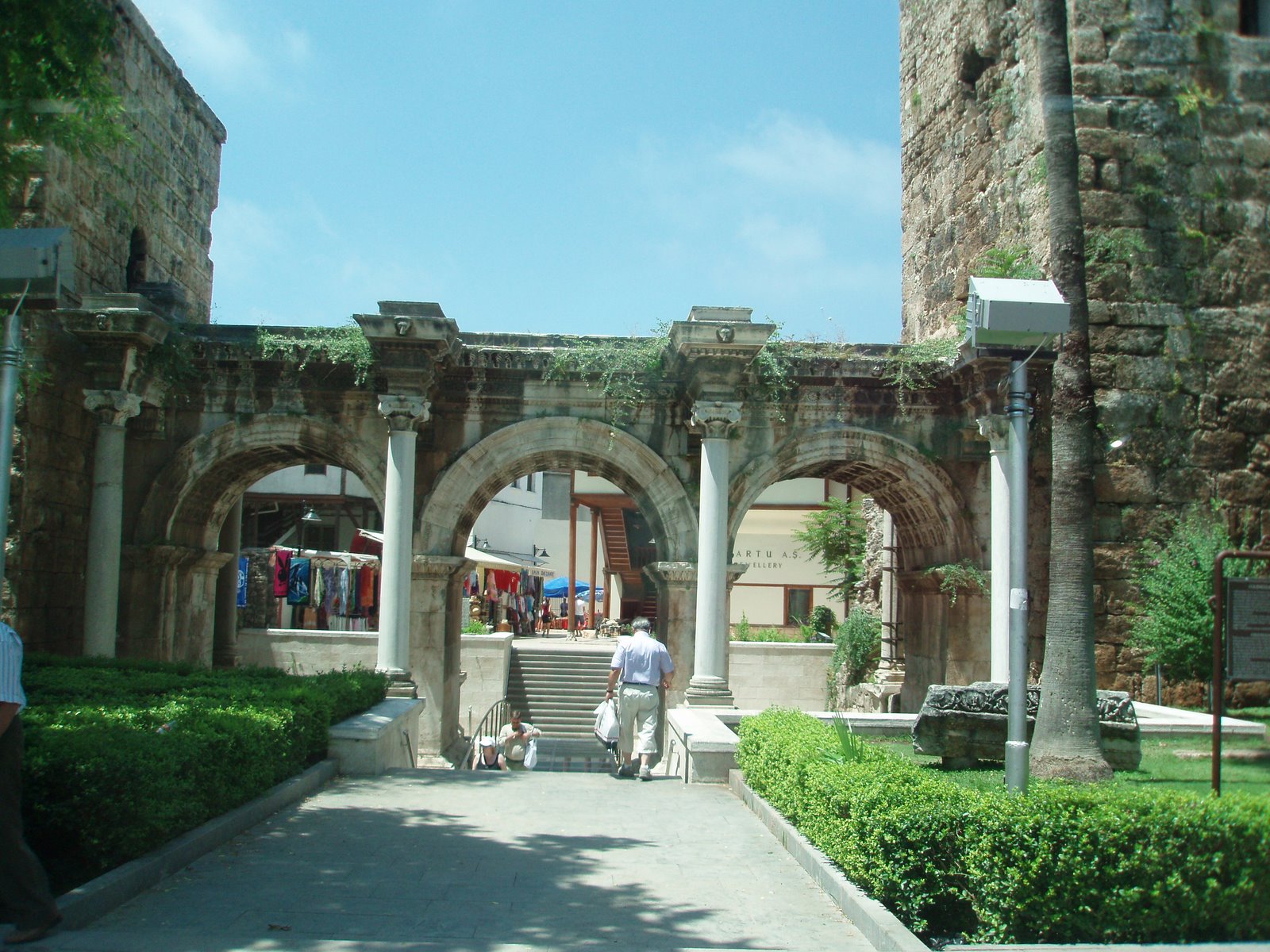 Разумеется, один из красивейших бульваров носит имя Ататюрка. Тут же и музей вождя. Обязательный зал, где принимал когда-то посланцев от народа. Такой же обязательный кабинет. И портрет героя на стене. Разумеется под национальным стягом.Разнообразие в современный урбанистический пейзаж вносит заросшая травой каменная стена. По нарастающему количеству разнообразных торговцев можно сделать вывод, что где-то рядом, несомненно, один из хитов туристического рынка. И действительно, вскоре перед глазами предстают старые арочные ворота. Они были воздвигнуты в 130 году в честь приезда римского императора Адриана. И с тех пор гордо сквозь века несут его имя. Каждый день под их сводами проходят тысячи туристов. Здесь проходит граница миров. С одной стороны остается суета современного города с современными зданиями и тенистыми пальмовыми бульварами. С другой – открываются узенькие улочки древней Анталии.