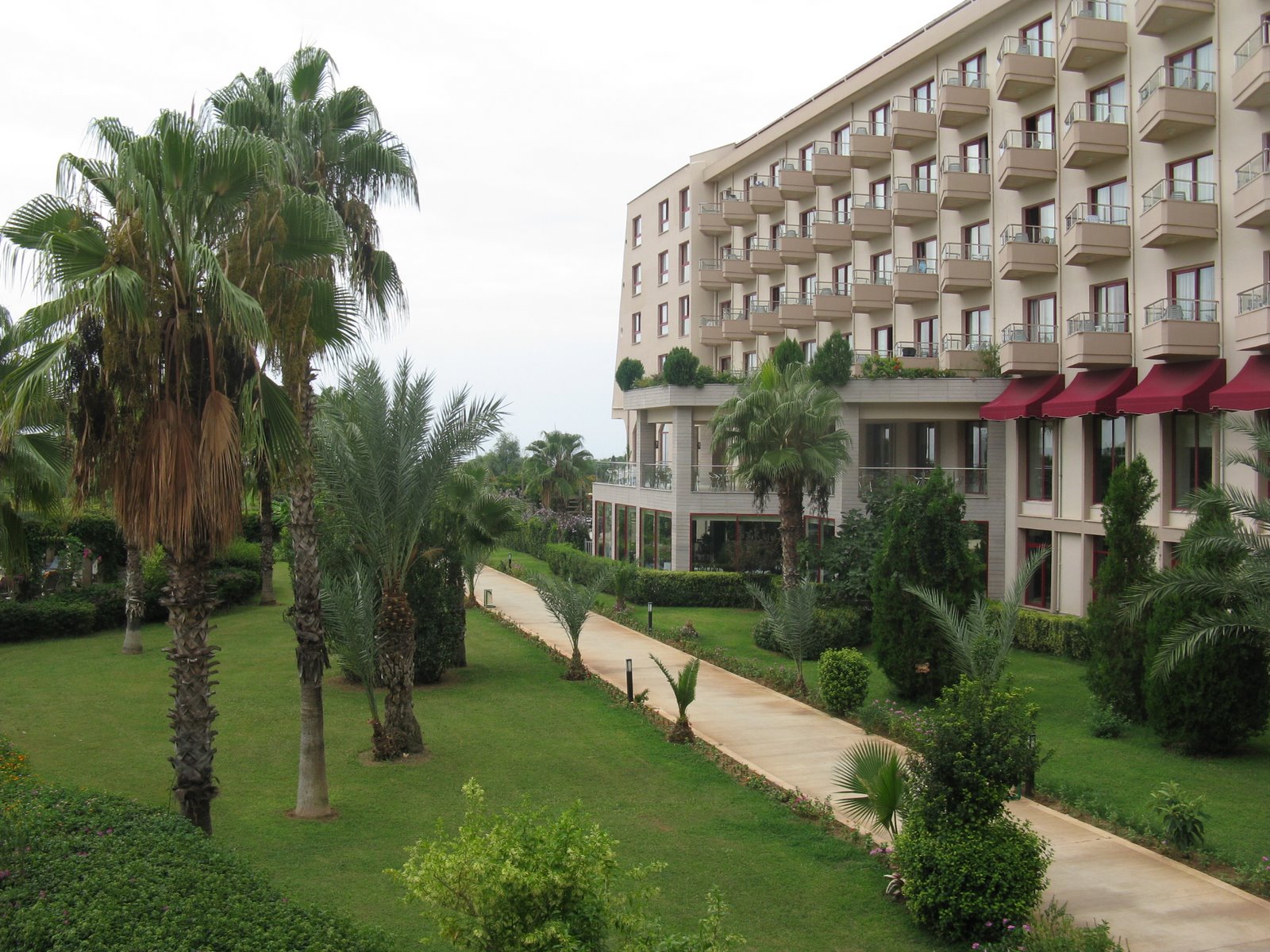 Еще несколько сот метров и автобус останавливается у главного входа в отель «JUSTINIANO Club Belek». Между прочим, на фасаде красуются пять звезд, хотя и турецких. Название не должно вводить в заблуждение. Не смотря на то, что написано Белек, находится отель все-таки на территории Кадрие. Хотя, вскоре это название будет выглядеть по-иному. Совсем недавно объект перешел в собственность российского «Интуриста».