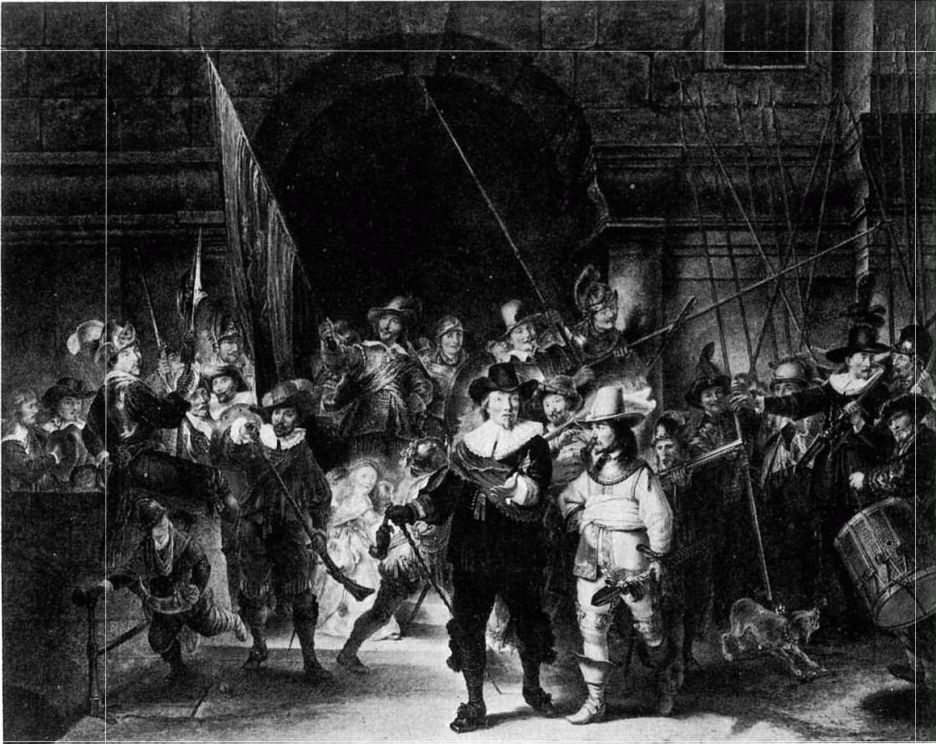 Стрелки времен Рембрандта это уже не те стражники-вояки, которые за несколько десятилетий до этого были оплотом, защищавшим страну от испанского нашествия. Теперь эти стрелковые сообщества практически поголовно представлены богатыми гражданами, мало что знающими о боевых действиях. Но законы жанра обязывают… И Рембрандт добавляет в полотно необходимее атрибуты героики: развивающиеся флаги, барабанный бой, мушкеты и т.п.