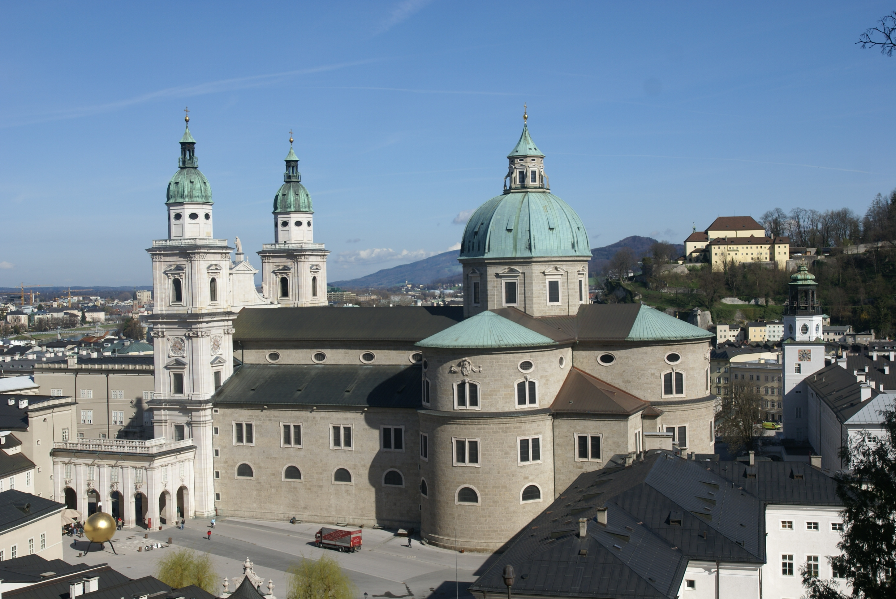 Важнейшей достопримечательностью Зальцбурга является его Кафедральный собор на площади Капительплац, построенный в 1614 году в стиле барокко на фундаментах древнего христианского храма, в нем крестили маленького Вольфганга Амадея Моцарта, которому суждено было прославить Австрию и родной Зальцбург, эта старинная купель сохраниласьь до сих пор и доступна для осмотра туристами. Интерьеры Кафедрального собора богато украшены старинными фресками, а фасад заметен издали благодаря возвышающимся над Соборной площадью величественным симметричным башням, высота которых составляет 79 метров. Фасад храма украшают огромные скульптуры апостолов Павла и Петра, святых Руперта и Виргилия, но особенно привлекает музей самого красивого католического храма города – в нем выставлены на всеобщее обозрение раритеты из сокровищницы, бесценные картины и шедевры искусства, уникальные редкости в единственном экземпляре.