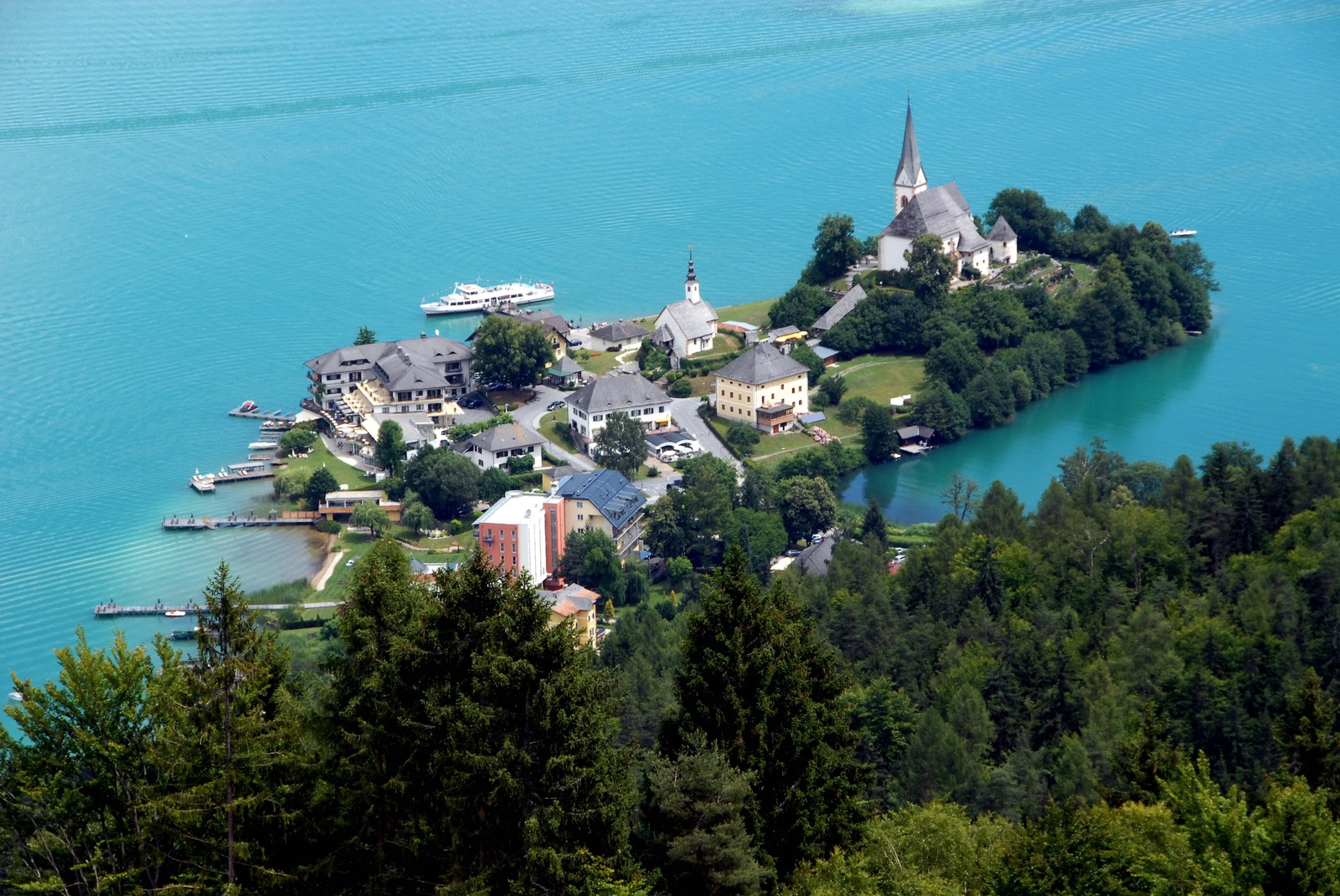 Дальше дорога, круто петляя, поднимается сквозь лес все выше. Вдоль нее есть много смотровых площадок, с которых открываются фантастические виды на горы и живописную долину реки Драва. Наконец, вдалеке показалась бирюзовая гладь озера Вайсензее. Это самое высокогорное озеро Каринтии, его высота над уровнем моря 929 м. Вода чистая, прозрачная и пригодная для питья. Зимой озеро полностью замерзает, поэтому и получило свое название — «белое озеро». Его белую гладь можно увидеть в фильме «Искры из глаз» из знаменитой «Бондианы».