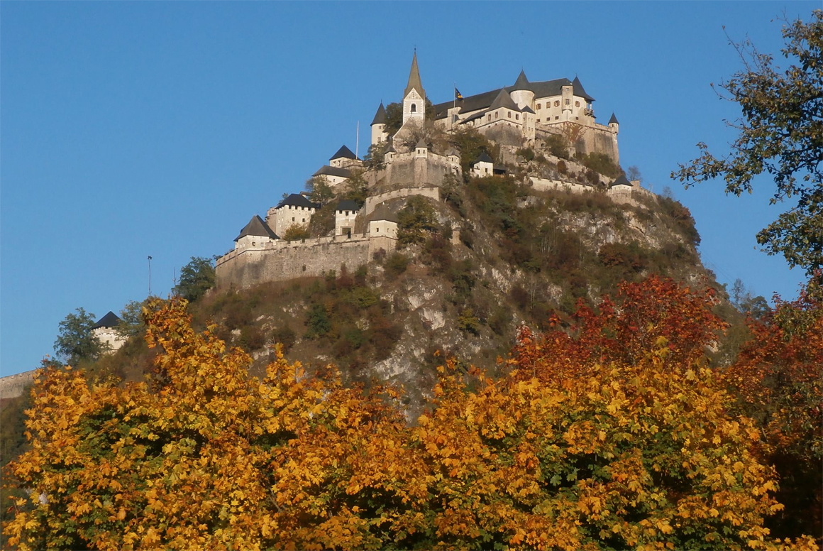 В 20 км к северу от Клагефурта на горе высотой 150 м величественно стоит замок Хохостервиц (Hochosterwitz). Его остроконечные башни и мощные стены видно издалека. Уже на подъезде охватывает такое волшебное чувство, как будто ты направляешься в настоящий замок из сказки. Хохостервиц – один из символов Каринтии. Замок был основан в 860 г, но основательно укреплен и достроен в 15 веке для защиты от турецких набегов, таким он сохранился до сих пор. Интересно, что мощные оборонительные сооружения строились не напрасно, замок так ни разу не был захвачен. Хохостервиц по сегодняшний день находится в частной собственности рода Кефенхюллеров. В 1580 г. владелец замка барон Георг Кефенхюллер завещал Хохостервиц в вечное владение своим потомкам и этот завет даже выбил на мраморной плите.