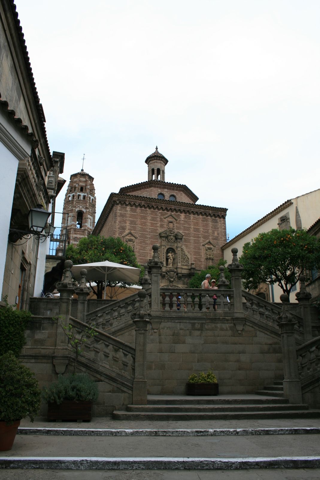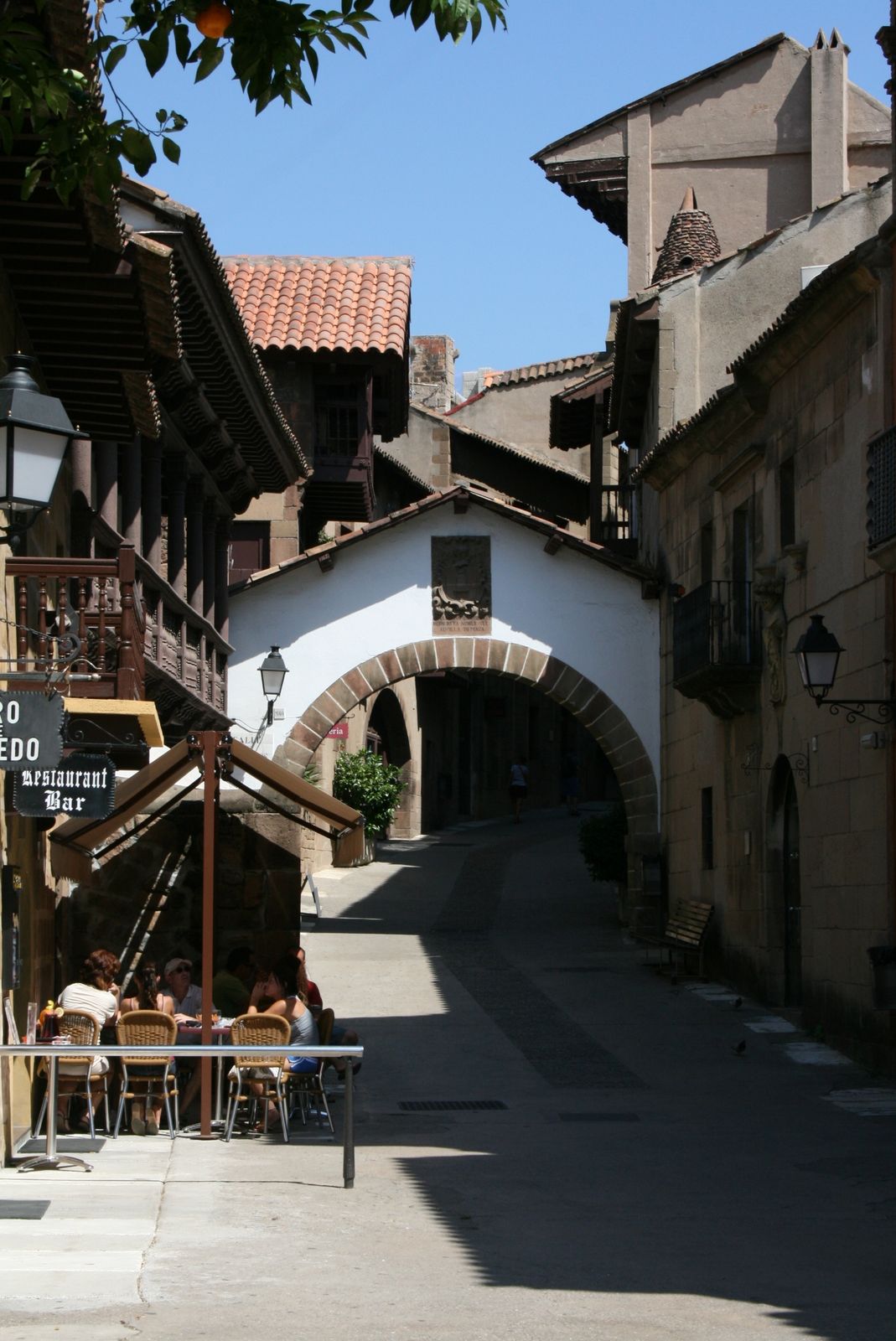 От площади Пласа Майор можно направиться не в одном направлении, а сразу в нескольких, но туристы рискуют зайти в тупик и вернуться в уникальное место вновь. Лестница Сантьяго-де-Компостела, расположенная в окружении самобытных домиков из Галисии, приведет посетителей города-музея к величественной башне Утебо. А с другой стороны центральной площади, напоминающей подобные образования во многих старинных городах Испании, уже тянется воссозданная улица Кабальерос, так сильно напоминающая узенькие старинные улочки Кастилии. Пройдя по мостовой, посетители Пуэбло Эспаньол могут увидеть необычную нависающую арку Майа, доминирующую над каменной кладкой мостовой, а далее улочка Кабальерос словно перерастает в самобытную улочку Принца де Вианы, вдоль которой находятся здания, характерные для Наварры и Страны Басков.