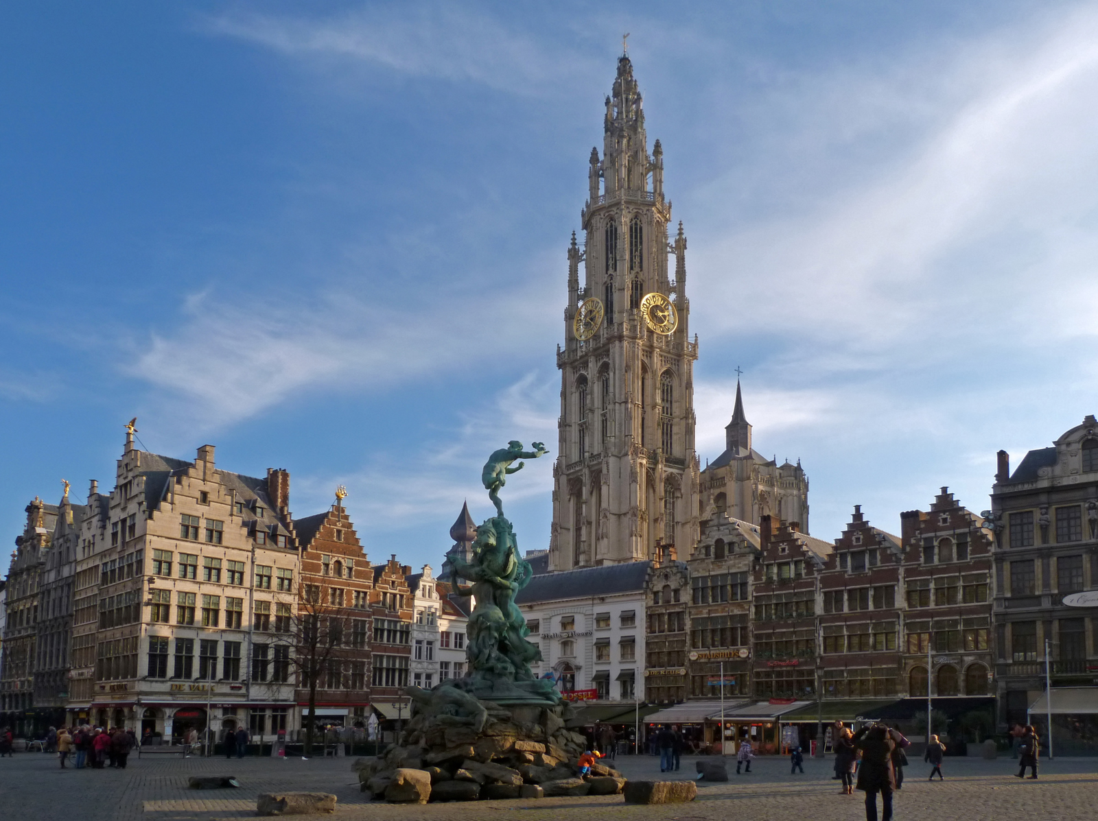 Знакомство с Антверпеном удобнее всего начать с посещения исторического центра города, где находится наибольшее скопление достопримечательностей – памятников архитектуры, храмов и музеев. Одним из самых красивых памятников архитектуры второго по величине бельгийского города можно назвать величественный Собор Антверпенской Богоматери в готическом стиле, заложенный еще в XIV столетии, спроектированный лучшим архитектором того времени Жаном Амелем. Собор строился около двух столетий. Храм чаще всего называют собором Онзе-Лиеве-Вроуве, под этим названием он внесен и в туристические каталоги. Старый мастер после сорока лет работы по возведению красивейшего храма, умер, а дело зодчего продолжил его сын Петер, а впоследствии – другие зодчие. Собор возводился медленно и основательно, во время его строительства произошел пожар, поэтому возведение южной башни пришлось начать заново. В 1616 году строительные работы закончились, но многие задумки архитектора так и не удалось воплотить в жизнь, поэтому специалисты считают этот архитектурный шедевр незаконченным, хотя и его фасад, и внутренний интерьер поражает туристов своей красотой. Хотя собор неоднократно подвергался вандализму – его громили сначала кальвинисты, уничтожившие готические витражи, усыпальницы и другие реликвии, а затем – войска Наполеона Бонапарта, в Антверпенском соборе есть что посмотреть. Ныне Собор Богоматери в Антверпене является крупнейшим готическим собором в Бельгии.