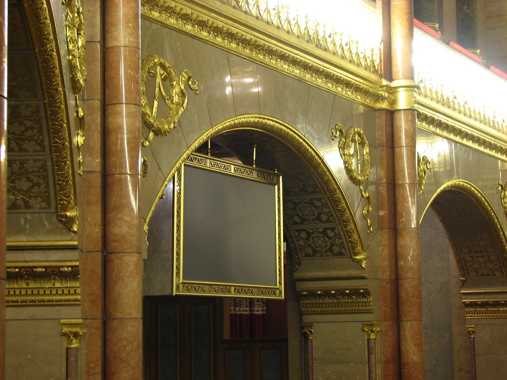 Зайдя в аванзал, посетитель оказывается перед изумительной парадной лестницей, он может увидеть и расписные плафоны на потолке, и нишу, в которой расположен бюст зодчего Имре Штайндля. Коридор – фойе опоясывает кольцом главный зал Главный зал, украшенный скульптурными композициями и портретами политических деятелей Венгрии и народных героев, сыгравшими значительную роль в истории народа. Среди них можно увидеть и изображение князя Арпада, под предводительством которого мадьярские племена перешли через Карпаты еще в конце IX столетия, а впоследствии завоевали и территорию Трансильвании. Выделяется и скульптурный портрет короля Иштвана I, известного в западной Европе как Святой Стефан, он основал королевство Венгрия и способствовал христианизации населения; и изображение Яноша Хуньяди – известного полководца, которому в 1456 году удалось под Белградом разгромить турецкие войска, вторгшиеся на территорию королевства.