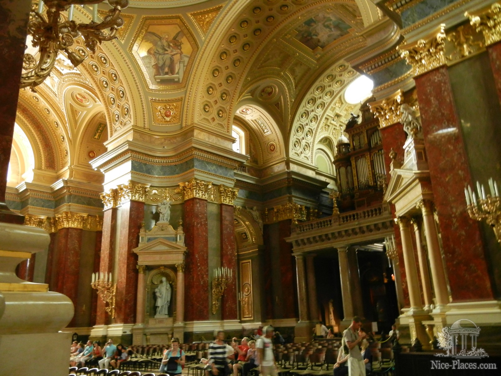 Божественно красиво и богато внутреннее убранство храма, созданное архитектором Йожефом Каузером. Мраморные колонны, изящная мозаика, цветные витражи с фигурами святых, скульптуры, картины, искусная позолота, на которой отражается свет горящих свечей, вызывает восторг и благоговение. Алтарь венчает скульптура Св. Иштвана, вокруг на барельефах сцены из жизни первого короля Венгрии. Мощи святого, его правая рука, бережно хранится в золотой раке слева от алтаря.