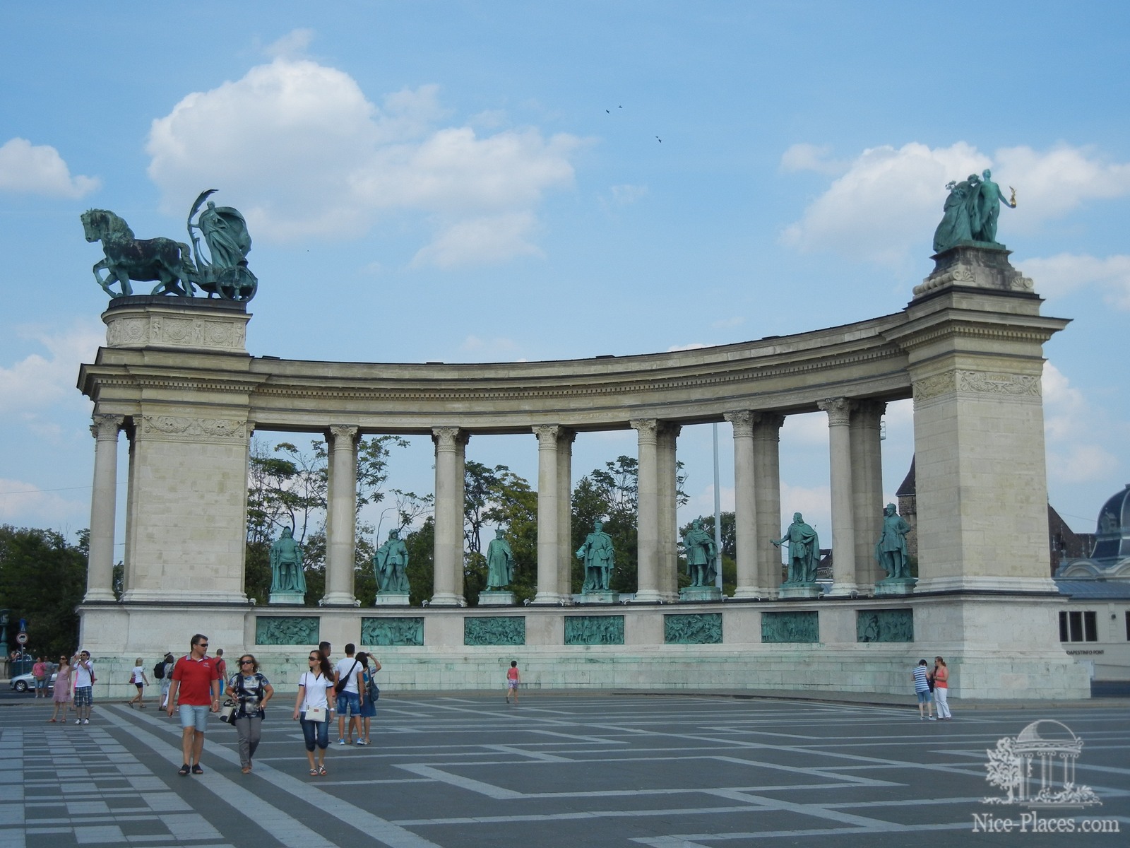 Высоко над всей площадью возвышается колонна с архангелом Гавриилом, побудившим во сне Иштвана Святого обратить свой народ в христианство. Внизу с князем Арпадом во главе, славным родоначальником королевской династии, гордо восседают на конях вожди семи племен мадьяр, которые привели венгерский народ от Урала, через Карпатские горы к Дунаю, где венгры и обрели свою родину. В память о венграх, погибших в мировых войнах, у подножия колонны установлена мемориальная плита. Позади – две колоннады со статуями королей и героев Венгрии, которые с помощью Мудрости и Славы, Мира и Войны, Процветания и Труда, воплощенных в скульптурах на колоннаде, привели народ Венгрии к независимости.