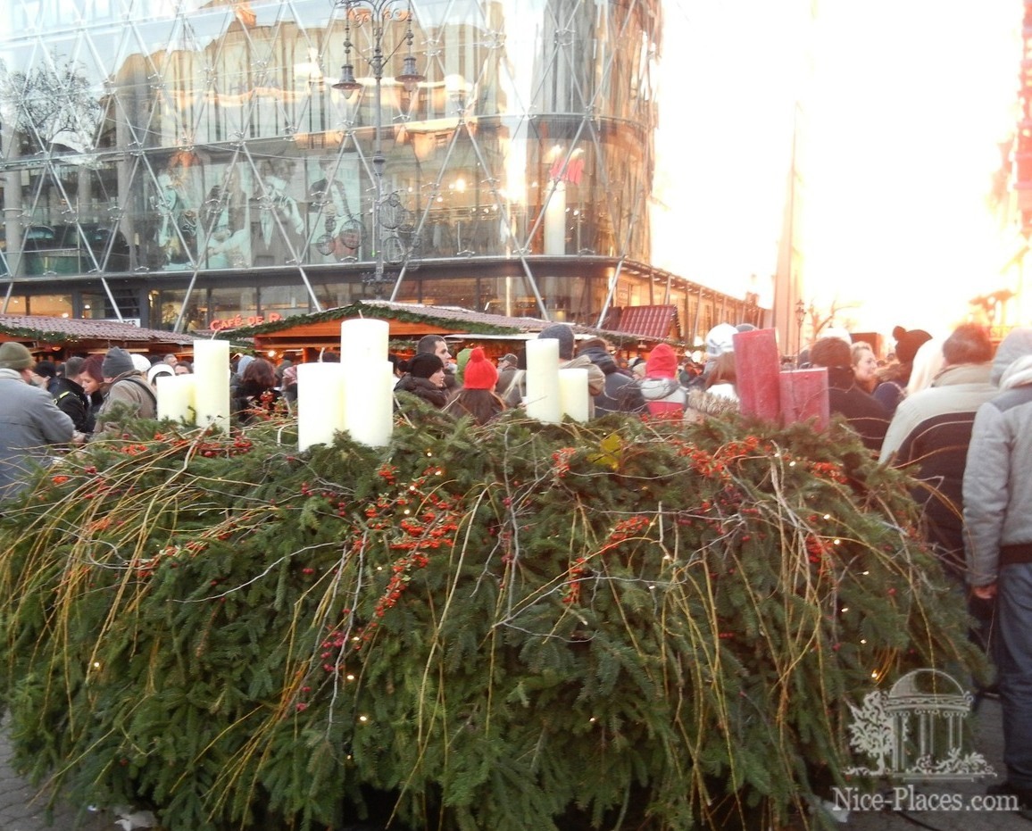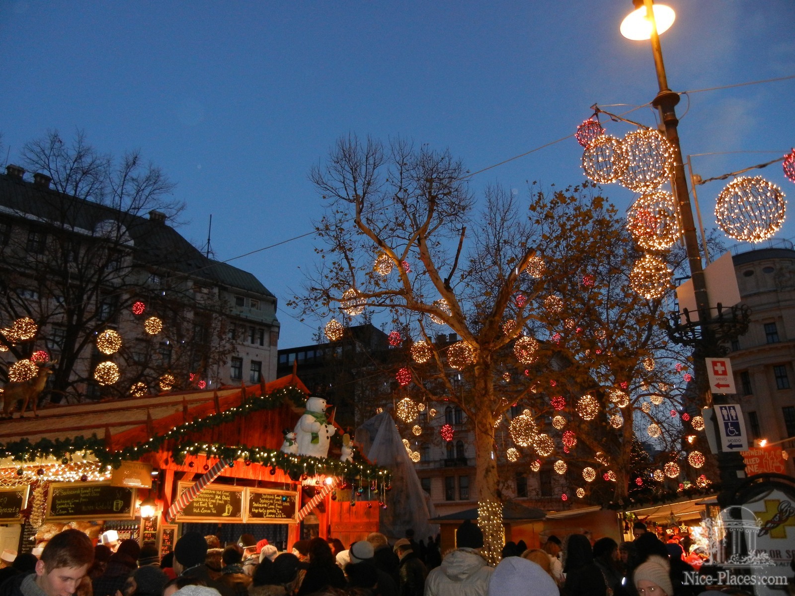 От площади Героев направляемся обратно в сторону Дуная, там на площади Vörösmarty tér (смотрите карту) уже начала свою бурную деятельность одна из наибольших рождественских ярмарок Будапешта. Организованно все на хорошем уровне: достаточно места даже для большого скопления людей, столики для еды, разнообразная и очень вкусная кухня в станках, красивая подсветка, бесплатные, хорошо оборудованные туалеты.