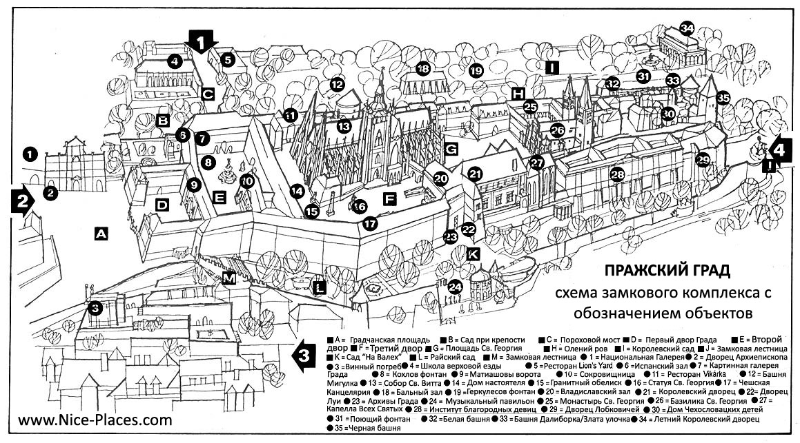 Доминирует над всем кафедральный собор всего города – собор святого Витта. Недалеко от него — скульптурное изображение святого Георгия, сражающегося с драконом, указывающее на вход в базилику Св. Георгия, которая сейчас используется для проведения концертов и экспозиции картин Национальной галереи.