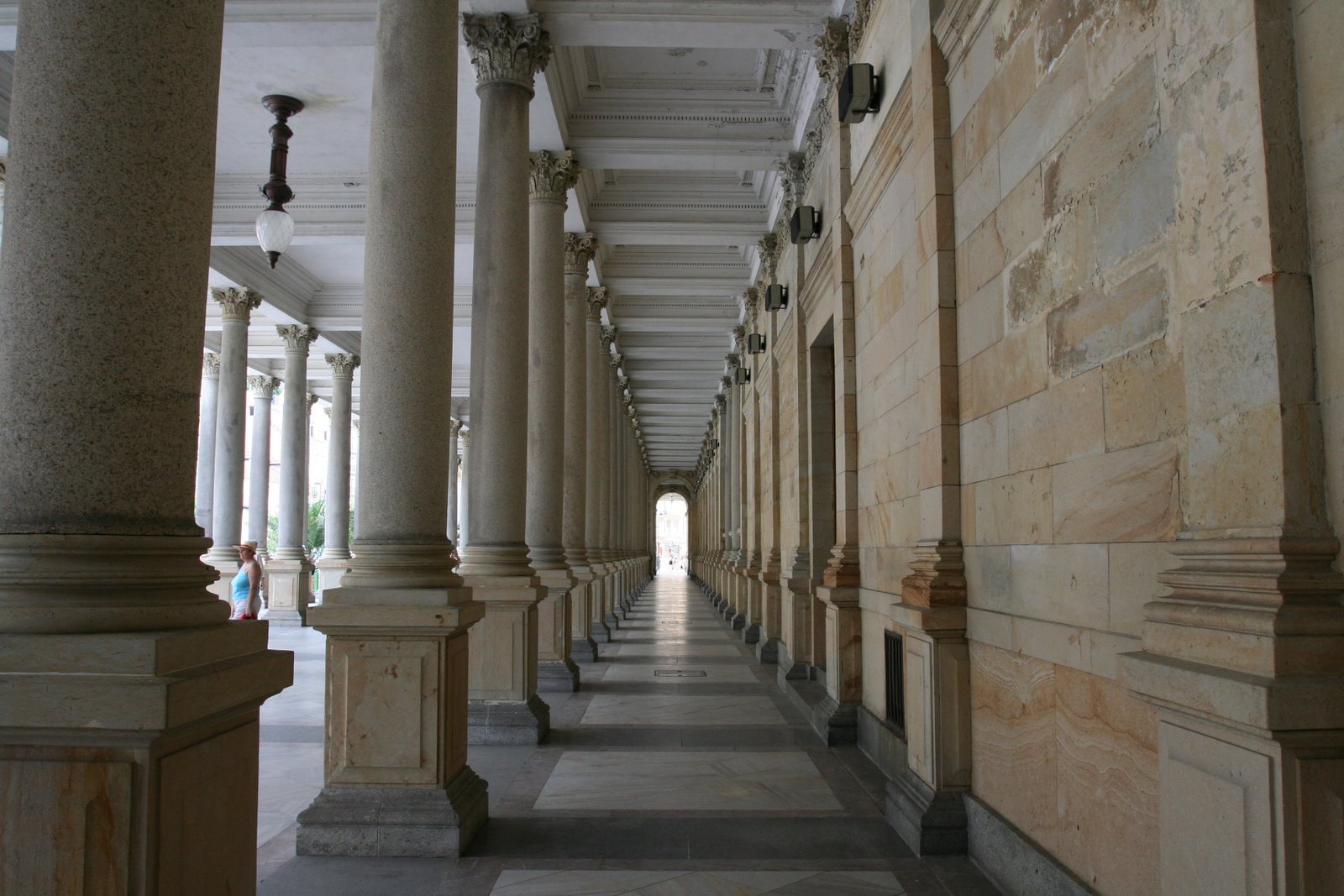 Карловы Вары как бы разделены на две части небольшой речушкой под названием Тепла. Воды этой реки обладают своеобразным и резким запахом, который обусловлен наличием в данной местности множества термальных источников, придающих воде специфический аромат. Однако спустя несколько минут человеческое обоняние адаптируется, и уже перестаешь испытывать любые неудобства от необычного запаха. Именно на берегу реки Теплы и расположен один из негласных символов Карловых Вар – Мельничная колоннада, возведенная местным архитектором Иозефом Зитеком в конце XIX века. Кстати, он же прославился, как автор проекта знаменитого Пражского Национального театра.