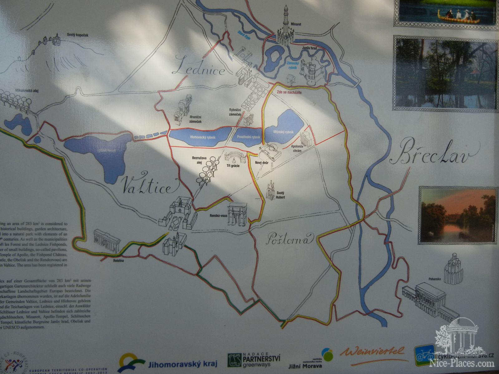Прямо возле ЖД вокзала находится несколько больших карт Ледницко-Валтицкого ареала. Там мы посмотрели, как лучше ехать из Бржецлава, карту маршрута смотрите здесь. Были приятно удивлены, что в Бржецлаве, оказывается, есть что посмотреть в плане интересной архитектуры. Город, кстати, благоприятен для поездок на велосипеде: повсюду вело-дорожки, стоянки, указатели, несколько мест отдыха под навесом.