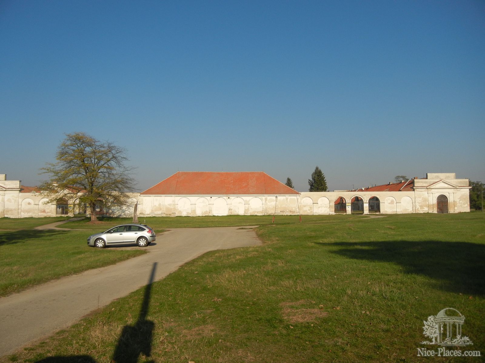 Первое, довольно масштабное, сооружение, которое мы увидели, выехав из Леднице, было Новый Двор (Nový dvůr). C 1809 здесь были хозяйственные конюшни, выстроенные вокруг четырехугольного внутреннего двора. Передний фасад образует арочная стена, по сторонам выполненная порталовыми въездами, а в центре соединенная с круглой ротондой. Ротонда предназначалась для содержания особо ценной породы овец-мериносов, очень чувствительных к условиям содержания. Сейчас Новый Двор является частной собственностью, здесь разводят и тренируют к верховой езде лошадей.
