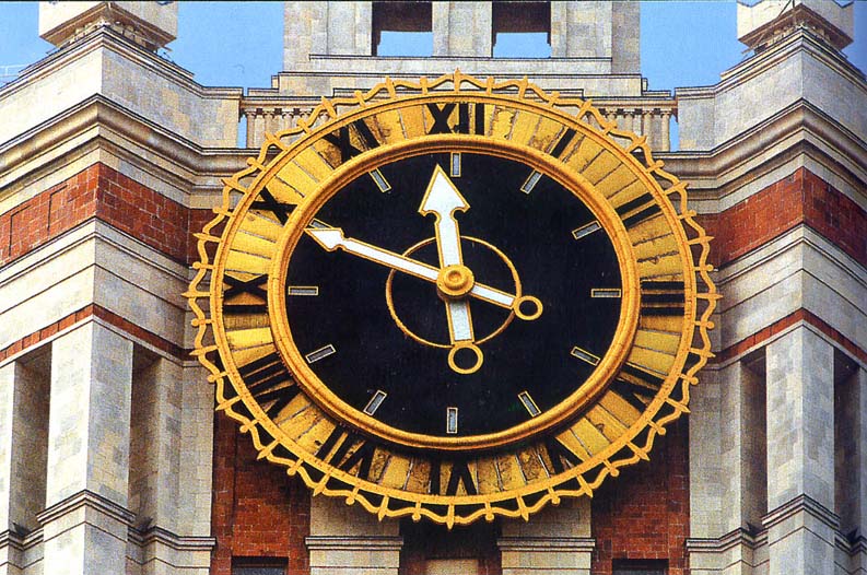 Часы МГУ появились на карте Москвы в середине ХХ столетия, с 1953 года они украшают фасад Московского Государственного Университета, построенного в лучших традициях московской архитектуры. Диаметр циферблата этих часов значительно больше, чем кремлевских курантов, он составляет девять метров. Минутная стрелка весит 39 килограмм, а ее длина составляет 4,2 метра. А часовая стрелка весит целых 50 килограмм, а ее длина составляет 3,7 метров.