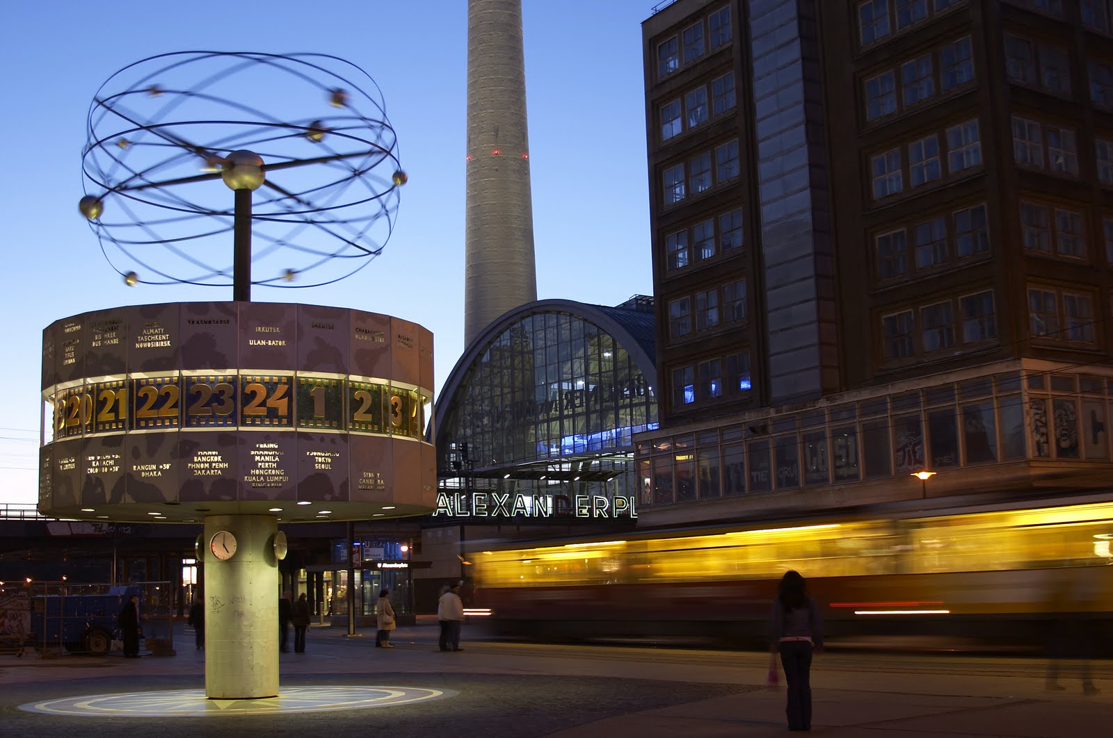 Немецкие часы «Всемирное время» находятся в Берлине, на площади Александерплац, они появились на карте города в 1969 году, и вызывают интерес благодаря своей необычной конструкции. «Всемирное время» не являются башенными часами. Они характеризуются уникальной вращающейся конструкцией, высота которой составляет 10 метров, а вращающийся цилиндр с цифрами высотой 2,7 метра больше похож на календарь, чем на часы.