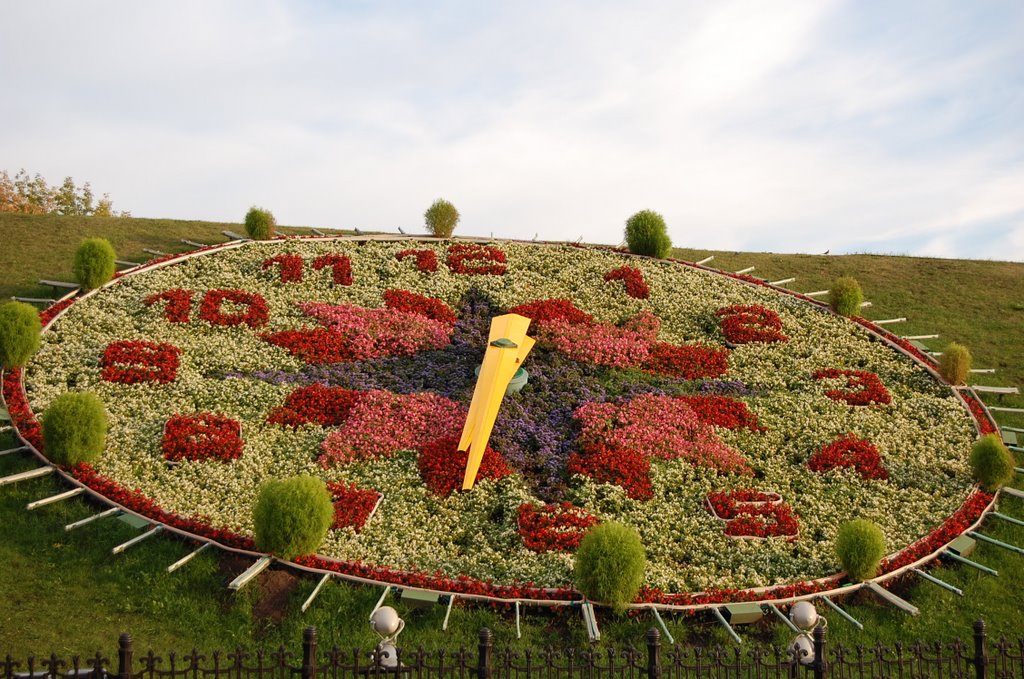 Цветочные часы на Поклонной горе в Москве появились сравнительно недавно – в 2001 году, на сегодняшний день они являются самыми большими часами в Европе. Диаметр часового циферблата составляет 10 метров, длина часовой стрелки составляет 3,5 метров, а минутной – 4,5 метров. Для покрытия часового циферблата живыми цветами необходимо не менее 8 тысяч цветов, которые высаживаются в определенной последовательности.