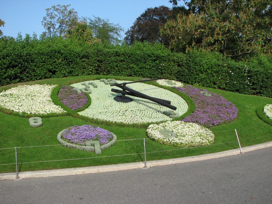 Цветочные часы в Женеве, в Швейцарии, находятся на территории Английского сада, они были основаны еще в 1955 году, и, в отличие от московских цветочных часов, имеют не только часовую и минутную стрелки, но и секундную. Длина секундной стрелки женевских цветочных часов составляет 2,5 метра, а диаметр циферблата – пять метров. Каждый год цветочный узор на циферблате выкладывается по новому, а его создания требуется 6,5 тысяч живых цветов.