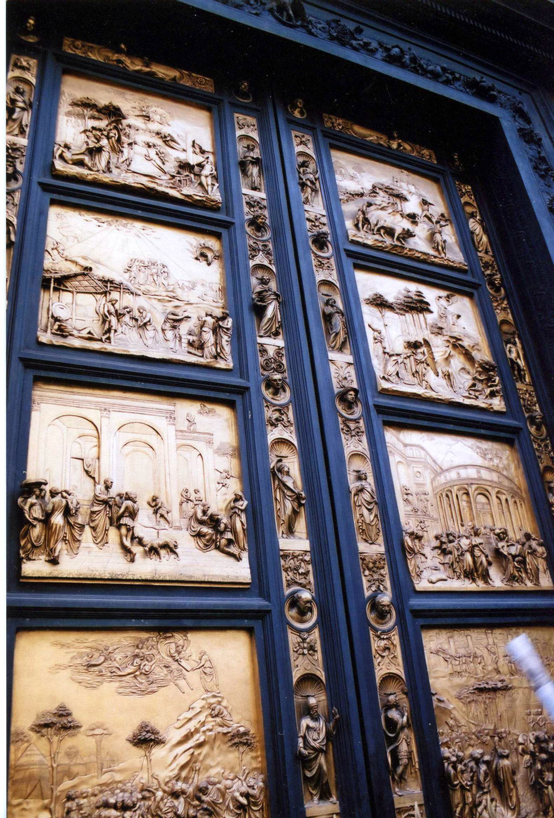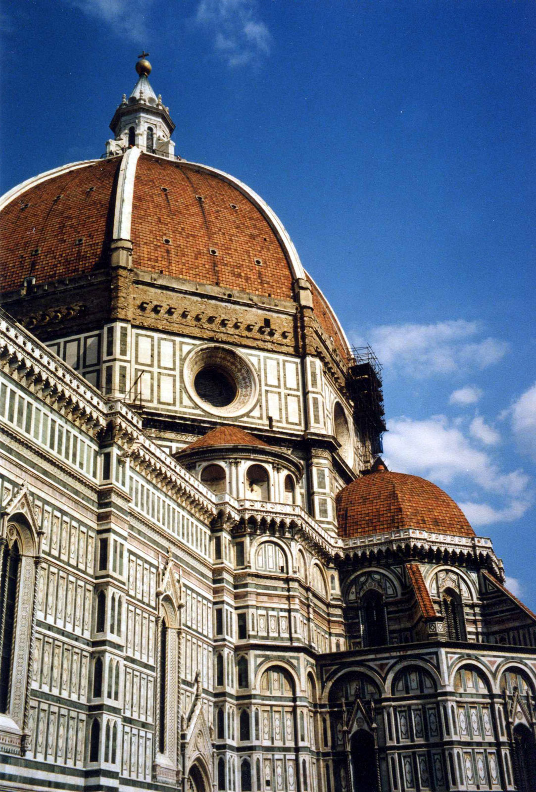 2. Пьяцца Дуомо. Одна из красивейших площадей мира. Именно во Флоренции французского классика — путешественника поразила болезнь, названная позже «синдром Стендаля» — невозможность человеческого мозга воспринимать красоту в таком количестве. Взор падает на величественный собор Санта-Мария дель Фьоре (4-й по величине в Европе, после храмов Рима, Лондона и Милана) с самым большим в мире куполом (42 м в ширину, 90 м в высоту, 416 ступенек к смотровой площадке), Баптистерий с изысканно выполненными Лоренцо Гиберти бронзовыми дверьми (Микеланджело назвал их «Врата рая»), мраморная колокольня XIV века, музей скульптуры Опера дель Дуомо. «Если башни – деревья, то соборы — горы. Особенно кафедрал Санта-Мария дель Фьоре и особенно когда смотришь из-за баптистерия, перед глазами пять уровней горной гряды – сам баптистерий, кампанила Джотто, фасад собора, купола абсид, купол Бруннелески. Бело-зеленый флорентийский мрамор – снег, мох, лес?» (Петр Вайль)