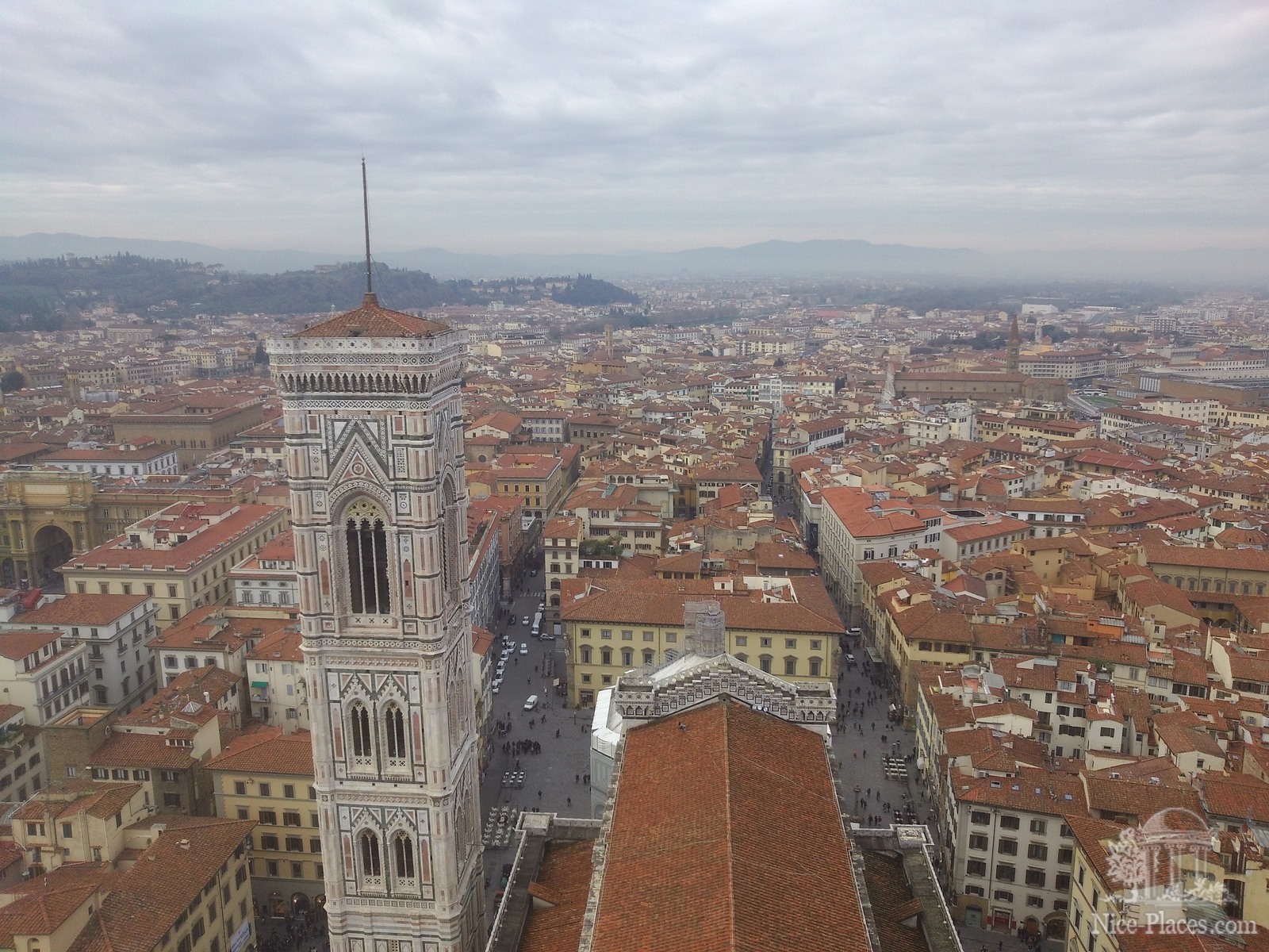 Нельзя уехать их Флоренции, не поднявшись на смотровую площадку Пьяццале Микеланджело, с которой открывается великолепная панорама города. По берегам реки стелется равнина, граничащая с покрытыми оливковыми рощами холмами. Этот пейзаж служил фоном многих картин художников XV века.