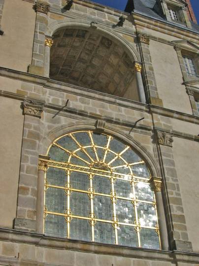 Именно в годы правления короля Франциска I был возведен величественный дворец, который сейчас является главной архитектурной постройкой замкового комплекса, над его проектом долгие годы трудился архитектор Лебрен. Грандиозный фасад королевского дворца выходит в просторный двор Белой Лошади, где когда-то устраивались рыцарские турниры, торжества и празднества. Во двор из королевского дворца можно спуститься по широкой лестнице, выполненной в форме подковы, ее пологие ступени предназначены для всадников. Округленные лестничные марши напоминают две соединенные между собою подковы, прилегающая к ним массивная балюстрада выполнена из камня, ее возвели лишь в 1634 году по проекту архитектора дю Серсо.