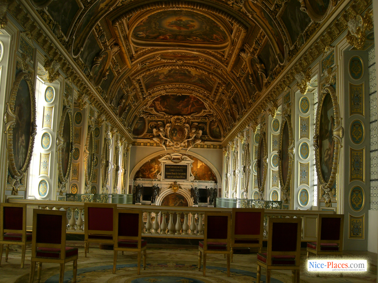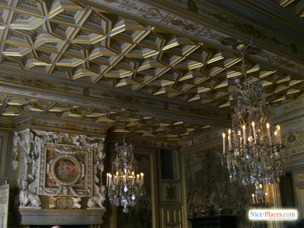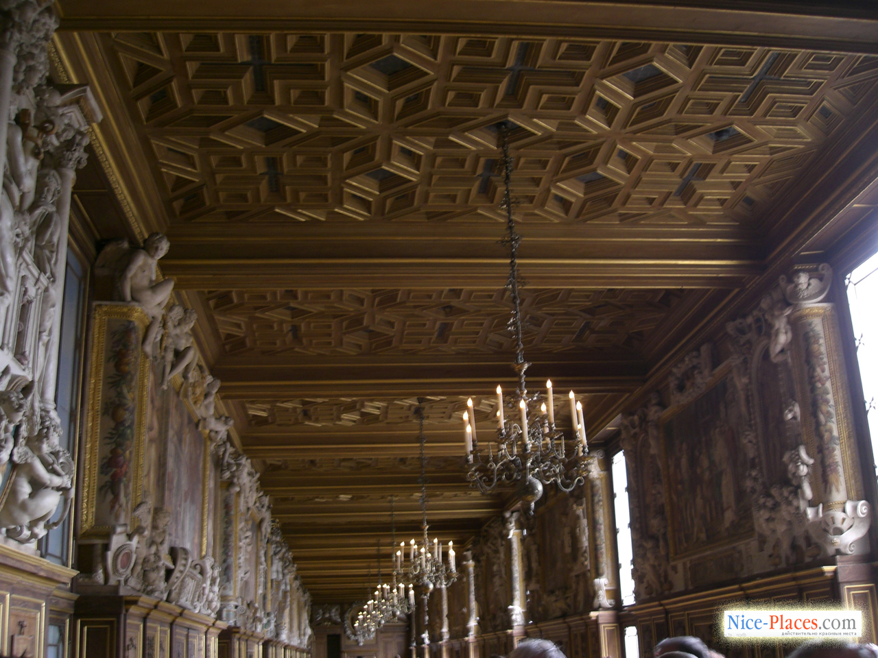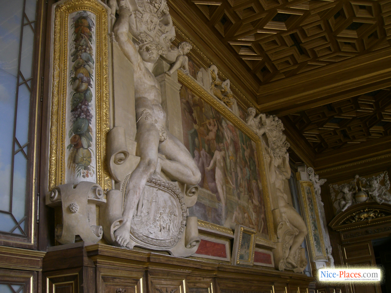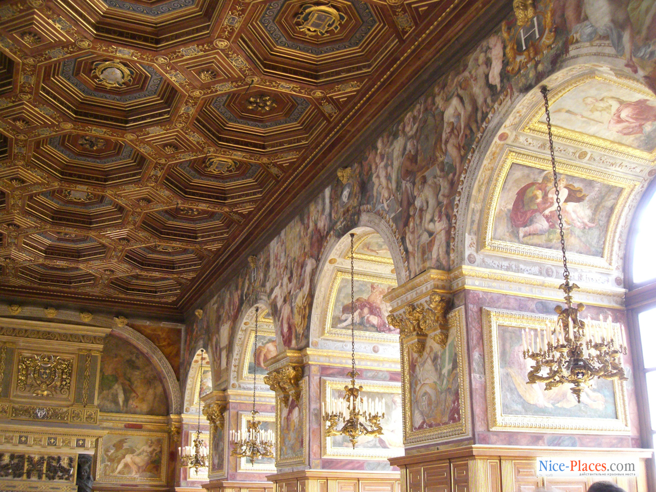 … В изысканной галерее, устроенной Франциском I, роскошные фрески включают аллегорические толкования классических сюжетов из мифологии, некоторые из них посвящены просвещенному королю. Символизм фресок усиливается и изображенная в огне саламандра – королевский герб, а также девиз Франциска I – «Nutrisco et extinguo», который можно трактовать как цели короля по распространению просвещения и уничтожения невежества и зла. Галерея строилась почти десять лет, в ней воплотилось не только передовые для Фонтебло моменты, но и сааме новые веяния в культуре, которые еще не были представлены нигде во Франции. Новейший на тот момент стиль оформления помещения, соединивший воедино скульптуру и живопись, получил выражение в стукковом обрамлении фресочных изображений. В XIX столетии галерея Франциска была полностью отреставрирована, умелым мастерам удалось сохранить ее ренессансный вид.