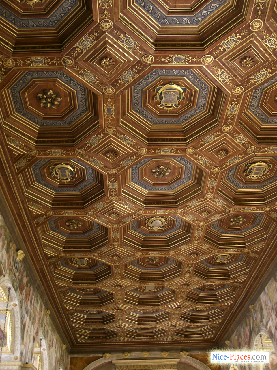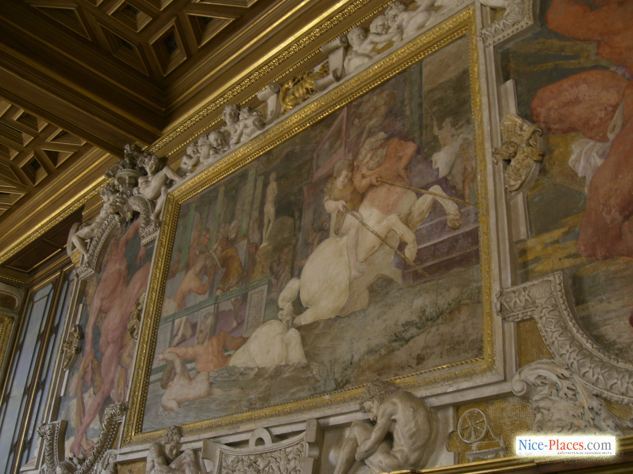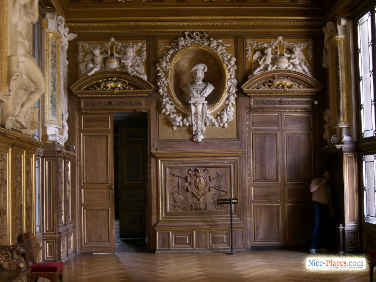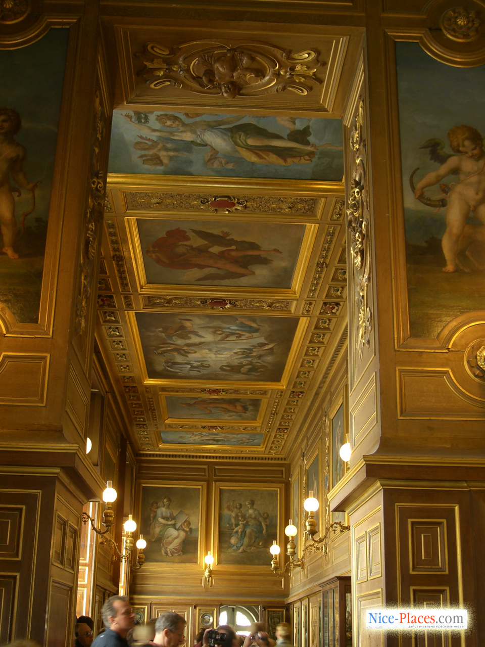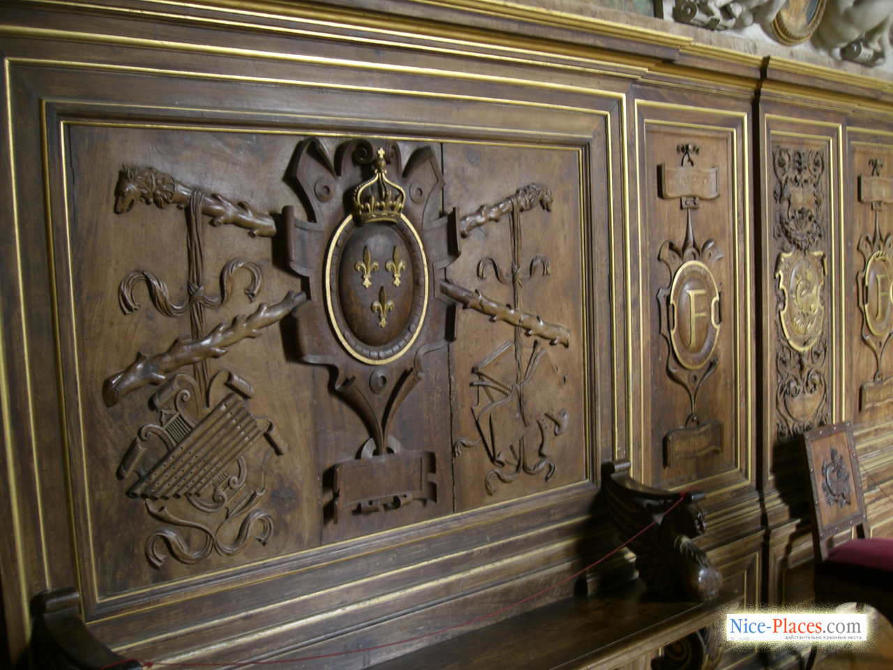 … В изысканной галерее, устроенной Франциском I, роскошные фрески включают аллегорические толкования классических сюжетов из мифологии, некоторые из них посвящены просвещенному королю. Символизм фресок усиливается и изображенная в огне саламандра – королевский герб, а также девиз Франциска I – «Nutrisco et extinguo», который можно трактовать как цели короля по распространению просвещения и уничтожения невежества и зла. Галерея строилась почти десять лет, в ней воплотилось не только передовые для Фонтебло моменты, но и сааме новые веяния в культуре, которые еще не были представлены нигде во Франции. Новейший на тот момент стиль оформления помещения, соединивший воедино скульптуру и живопись, получил выражение в стукковом обрамлении фресочных изображений. В XIX столетии галерея Франциска была полностью отреставрирована, умелым мастерам удалось сохранить ее ренессансный вид.