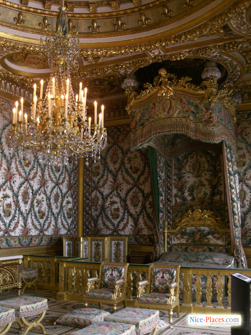 Император Наполеон Бонапарт вдохнул новую жизнь в королевскую резиденцию Фонтебло. Впервые новый суверен, по происхождению далекий от французских королевских династий и аристократических семей, приехал в замок Фонтебло в 1804 году, ужаснулся упадком некогда роскошного замка и приказал тотчас же приступать к восстановительным работам. Восстановительные работы шли быстрыми темпами, и уже в скором времени Наполеон Бонапарт смог уютно расположиться в обновленных королевских покоях на первом и втором этажах главного дворцового здания. Королевская спальня по заказу императора была преобразована в величественный тронный зал, а его трон сохранился до сих пор.