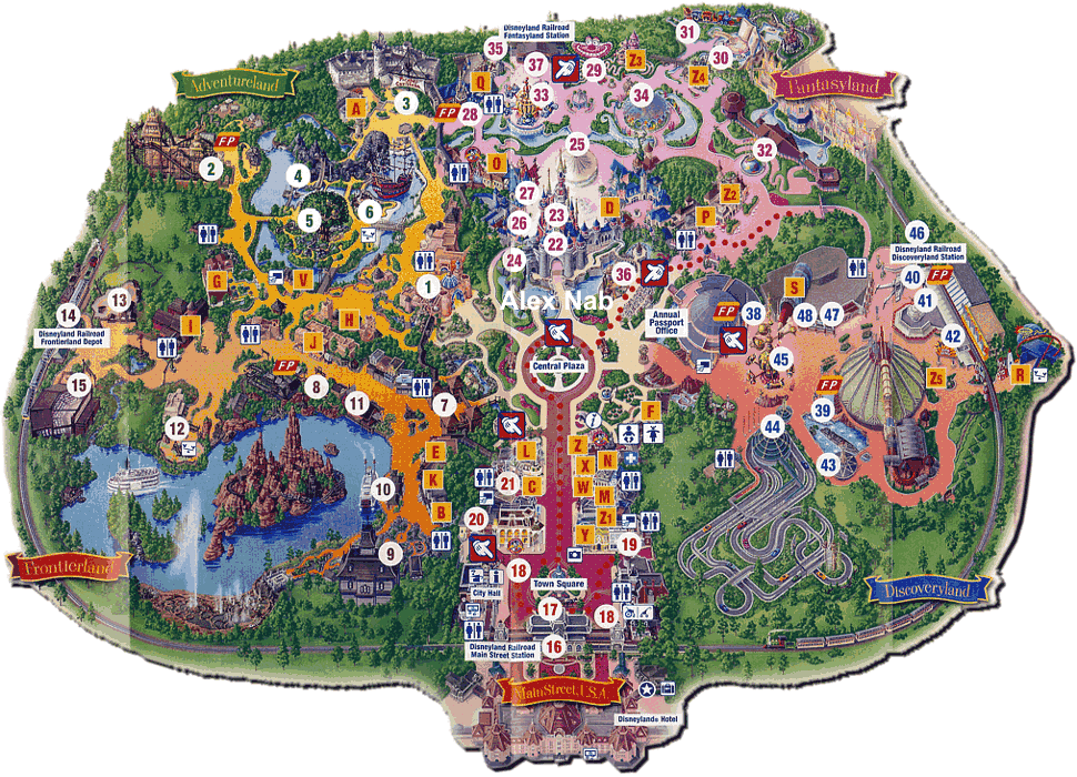 Парк развлечений Disneyland Park состоит из пяти округов: Main Street, U.S.A., Discoveryland, Fantasyland, Adventureland, Frontierland, которые объединяют на своей территории тематические аттракционы. Вот перечень основных: