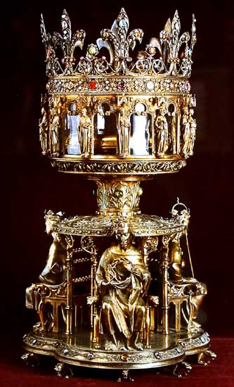 ице собора хранится еще один реликварий, который был создан художником и архитектором Виоле-ле-Дюком. Именно этот архитектор в шестидесятых годах XIX века заведовал реставрацией собора. Реликварий имеет форму королевской короны, которая покоится на подставке, украшенной литыми изображениями царственных лиц, которые преемственно обладали Венцом, – равноапостольной Елены, императора Бодуэна, и, наконец, Людовика IX Святого, держащего привезенную в Париж реликвию в руках.