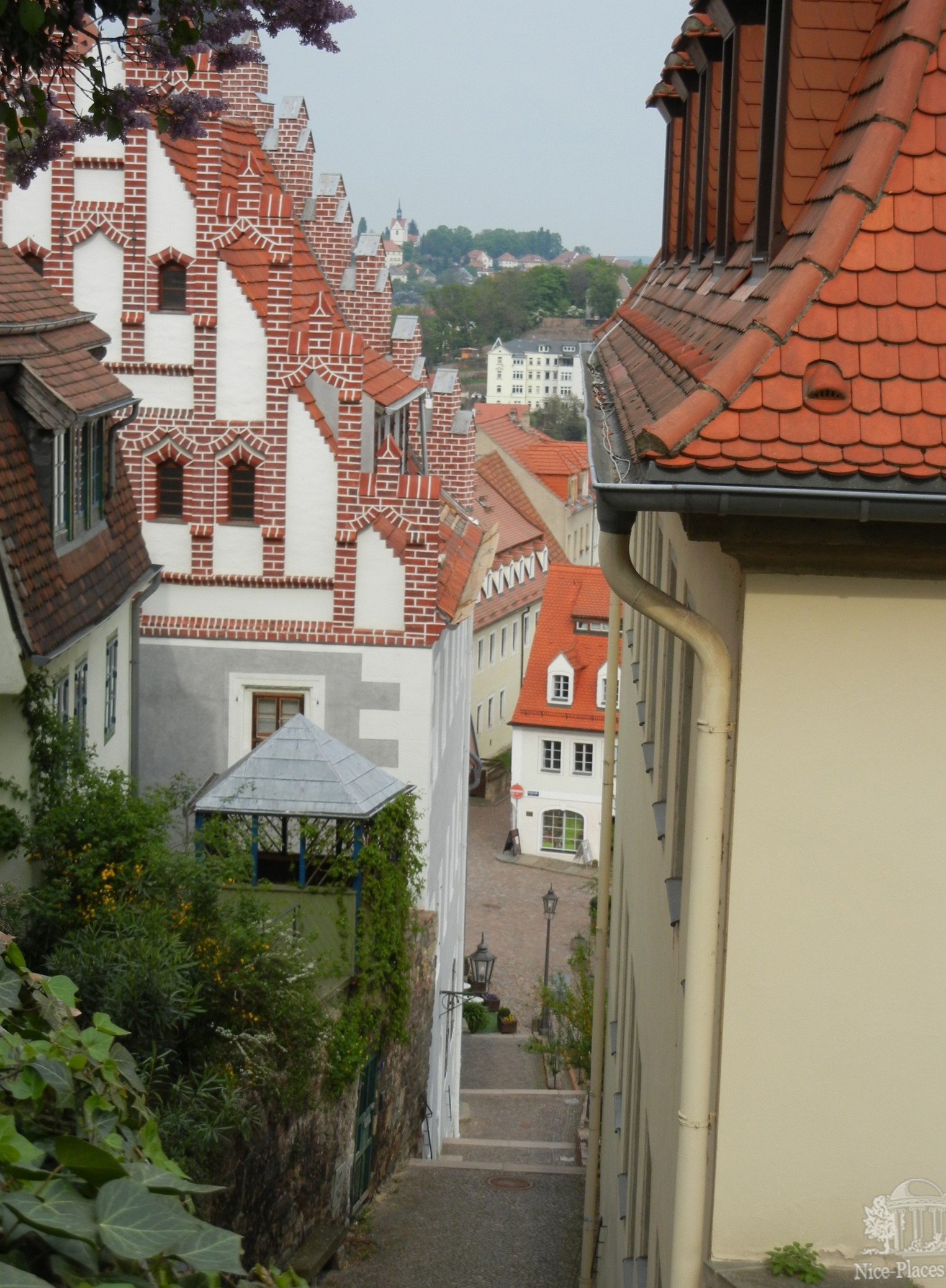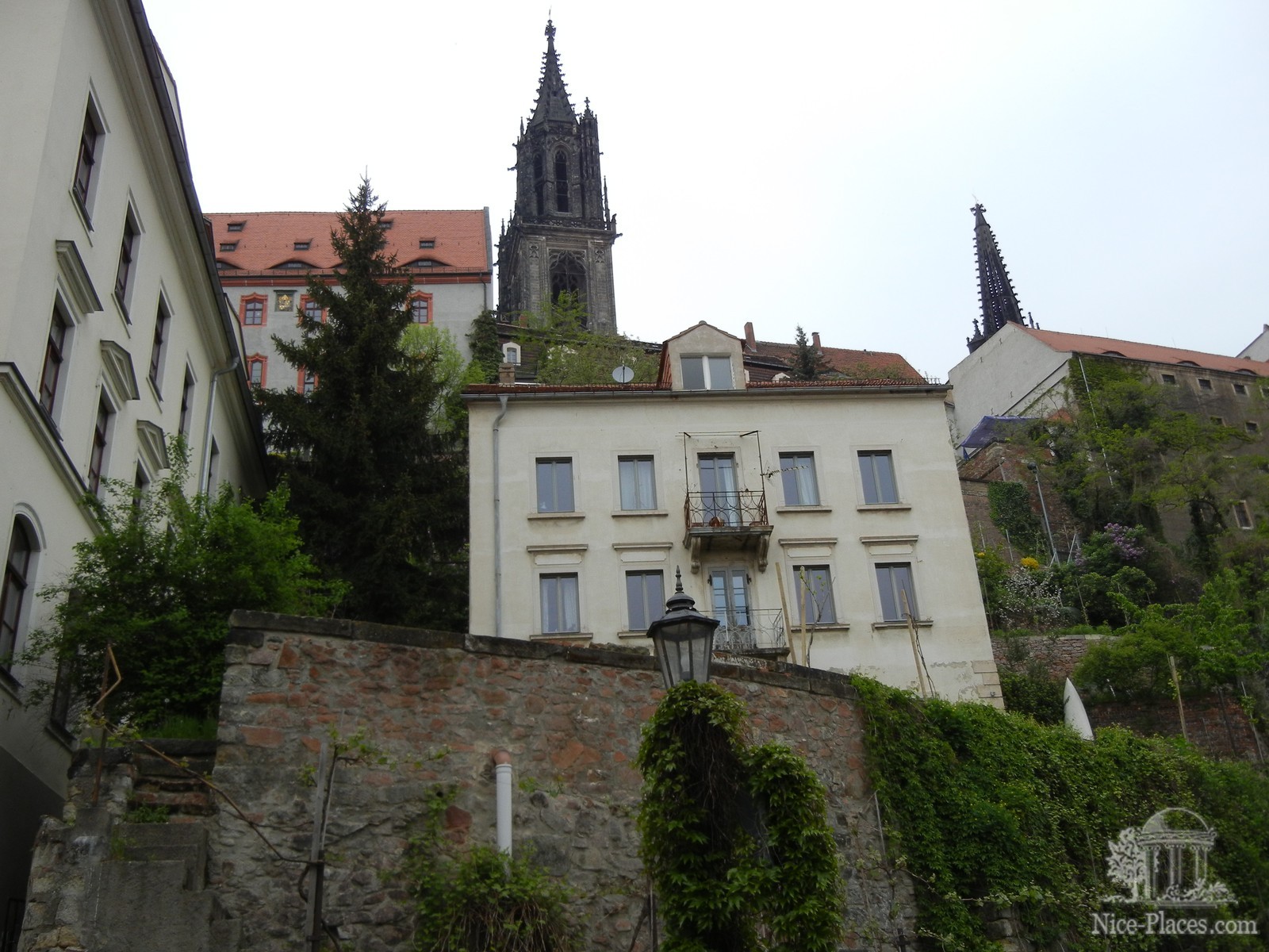 Далее выходим на мост Шлоссбрюкке, с которого открывается красивая панорама на поля, виноградники и частные домики Майсена. Кстати, средневековый Майсен лежит на фоне чарующего ландшафта долины Эльбы, окруженный виноградниками, поросшими лесом холмами и простирающимися вдоль реки лугами. Здесь находится саксонская зона виноделия. Из-за своего особо мягкого климата в долине Эльбы виноград дает превосходное сухое вино, которое почитается и туристами и местными жителями.