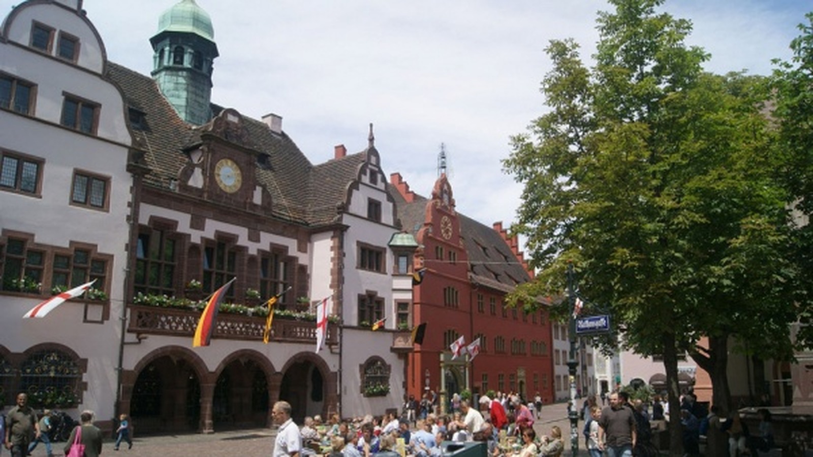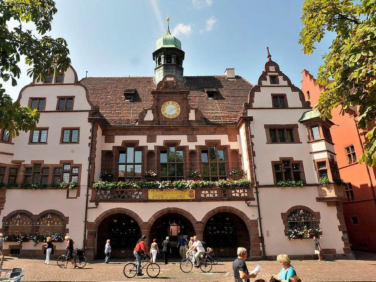 Очень интересна Ратушная площадь, где рядом расположены сразу две ратуши. Старая ратуша – это яркое здание красного цвета, поздняя готика, фасад, украшенный гербами. ХVI век, восстановленный после Второй мировой, но уже без многих былых красот и декорирования. Сегодня здесь туристический центр, где можно бесплатно получить карту Фрайбурга и буклеты. Белый фасад в стиле эпохи Возрождения – это Новая Ратуша. Тоже ХVI век, тоже яркое, бросающееся в глаза здание, а на крыше колокольня, ежедневно в полдень звучит классическая и народная музыка. Специально подошли послушать. Заодно подслушали рассказ экскурсовода о том, что здание Новой ратуши… старше здания Старой ратуши на двадцать лет. Объясняется это просто: Старая ратуша изначально была построена для администрации города, а Новая успела побывать жилым домом, корпусом университета и клиникой, и только в начале ХХ столетия превратилась в Ратушу. И чего только порой не бывает в старинных таких городах…