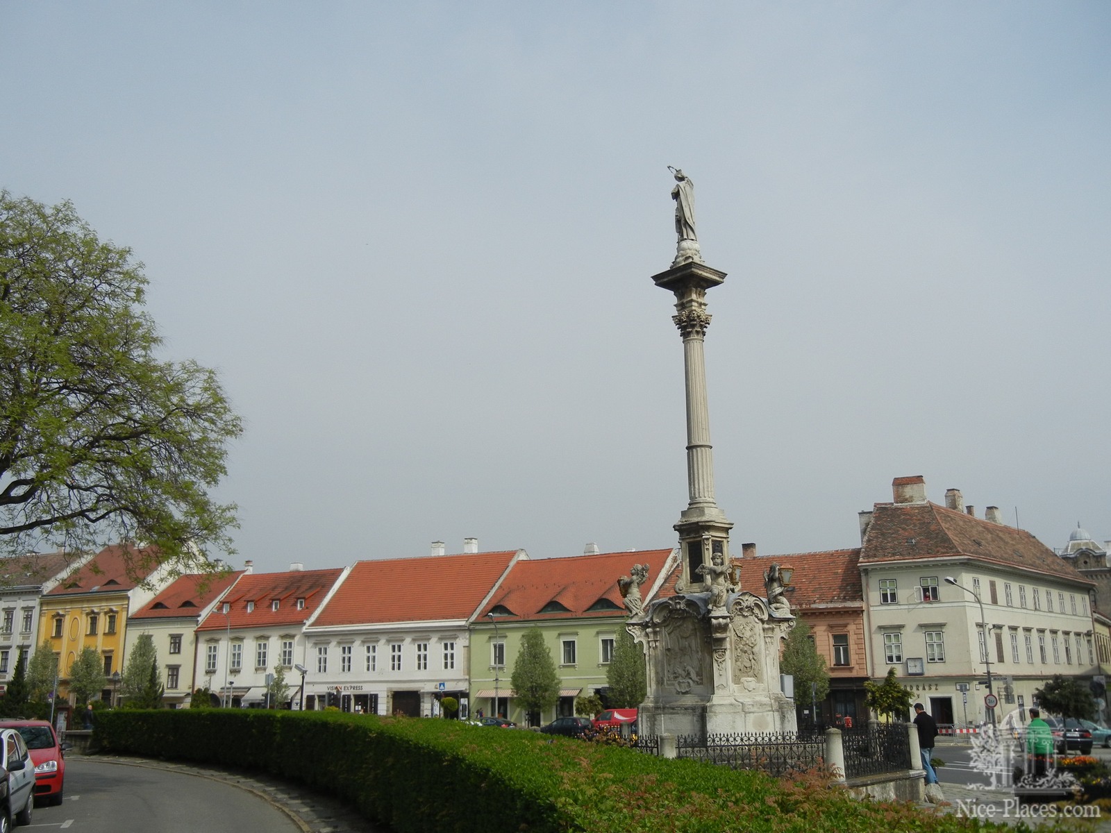 Спустившись вниз, выходим на Главную площадь и упираемся в колонну Пресвятой Троицы или Чумной столб. Такие сооружения характерны для всей Западной Европы как благодарность Деве Марии за прекращение эпидемии чумы. В Шопроне этот памятник установил на свои средства горожанин Янош Якоб Левенбург в память о супруге Еве, умершей от этой страшной болезни.