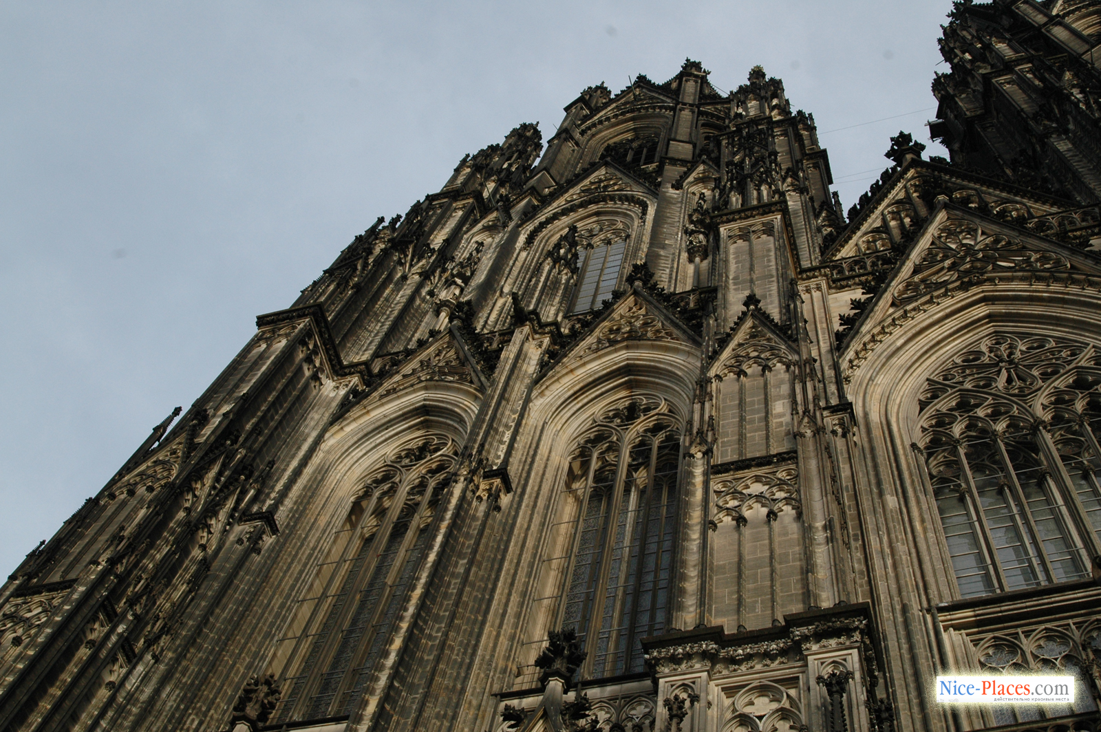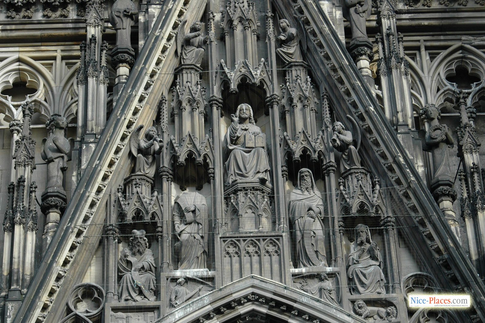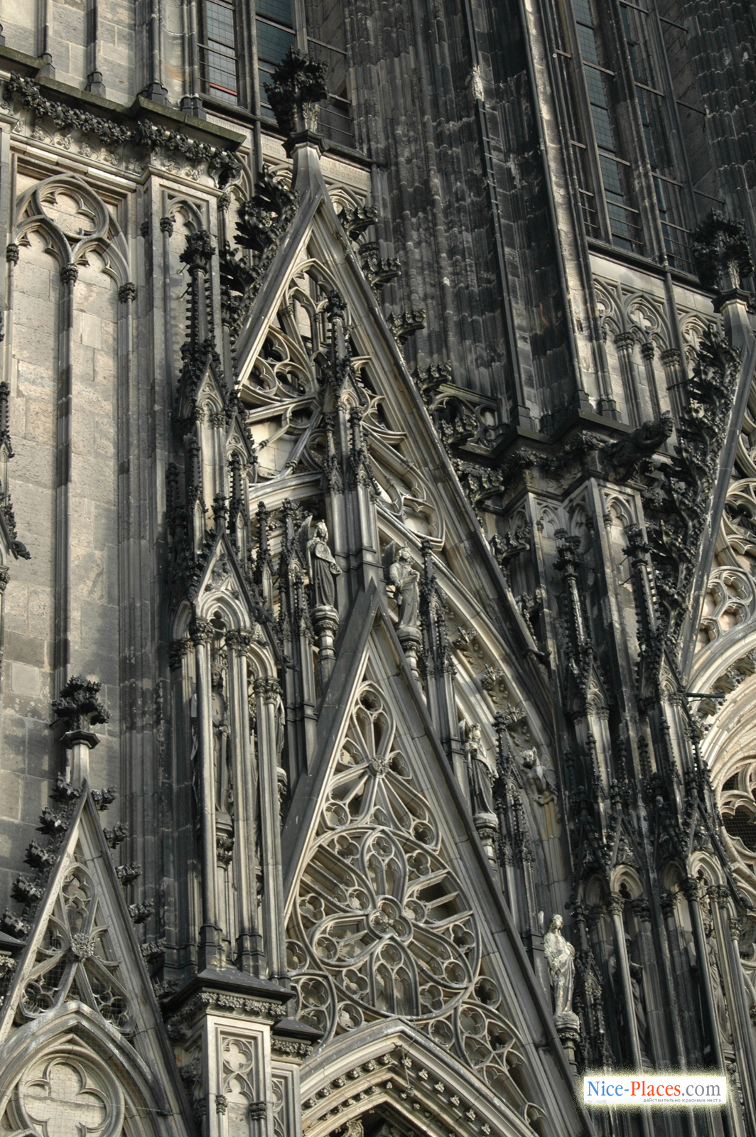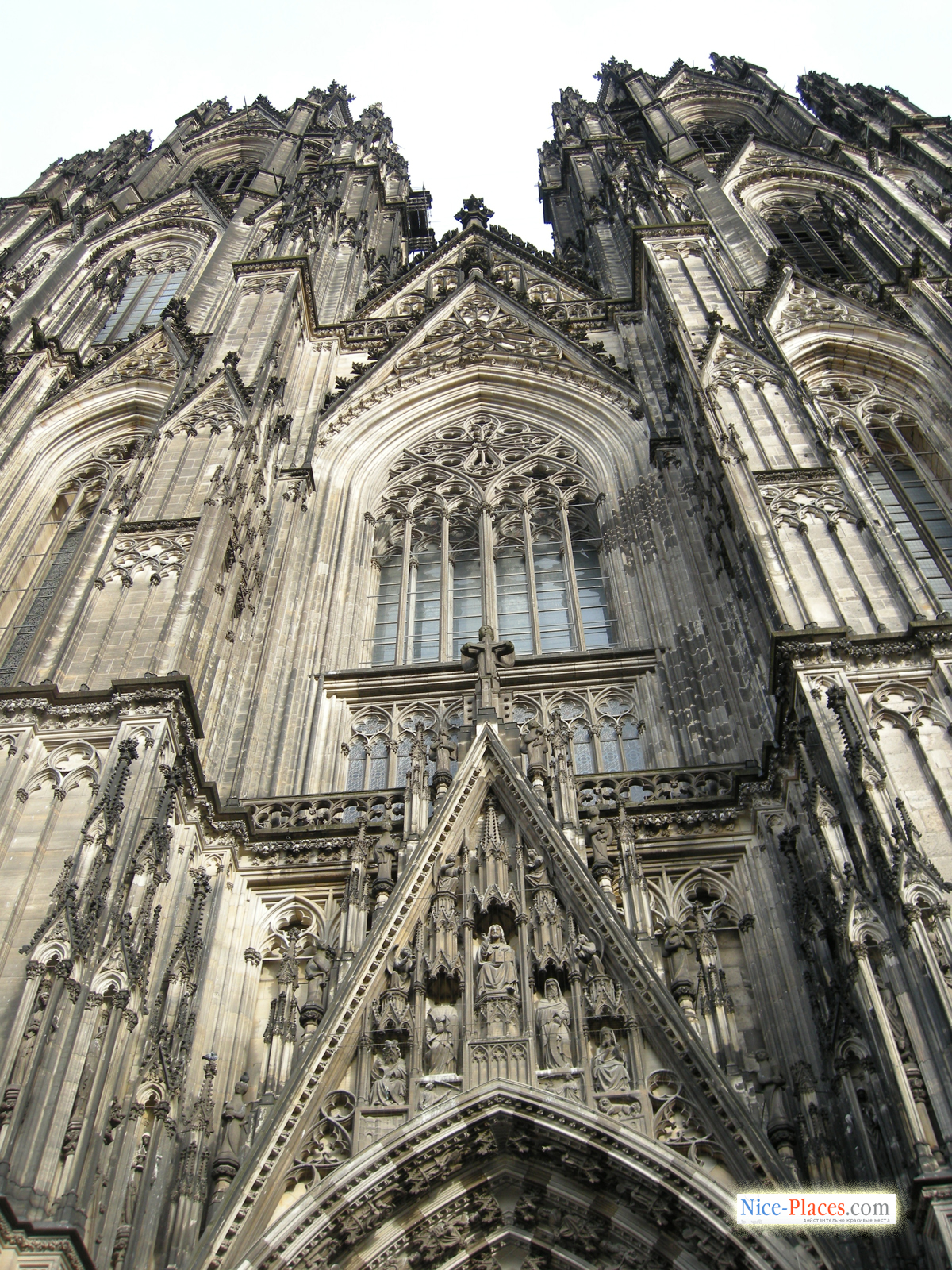 Рассматривая фасад архитектурного шедевра, поражаешься мастерству средневековых зодчих, сумевших гармонично совместить бесчисленное количество опорных пилястров и, словно невесомых, сквозных решеток, легких галерей и аркбутанов, фиалов и ажурных стрельчатых арок. Фасад Кельнского собора богато украшен уникальными скульптурами и декоративной резьбой, каждый ярус собора выглядит по-своему и при этом не вступает в противоречие с остальными. Чтобы прочувствовать величие и монументальность Собора Святых Петра и Марии, нужно войти внутрь храма и увидеть основной зал сакрального сооружения, окруженный многочисленными капеллами и часовнями, а 44-метровые колонны поддерживают звездчатые своды. Создается впечатление, что не только молится, но и мысли посетителей собора устремляются в небо, к Богу. Такое ощущение возникает не только благодаря грандиозности и высоте постройки, но и с помощью проекта здания – каждый неф уже предыдущего, средний неф в несколько раз выше боковых, выполняется игра света при помощи перепада высот, даже хор и нефы расположены на разных уровнях. Собор изнутри отделан рейнским камнем – им выложены свод, стены и даже потолок храма. Чтобы подняться на колокольни, расположенные в двух примыкающих по бокам башнях, нужно пройти по извилистым каменным винтовым лестницам, каждая из которых насчитывает 509 ступенек. А, используя колокольню как смотровую площадку, можно увидеть открывающуюся со стометровой высоты панораму города.
