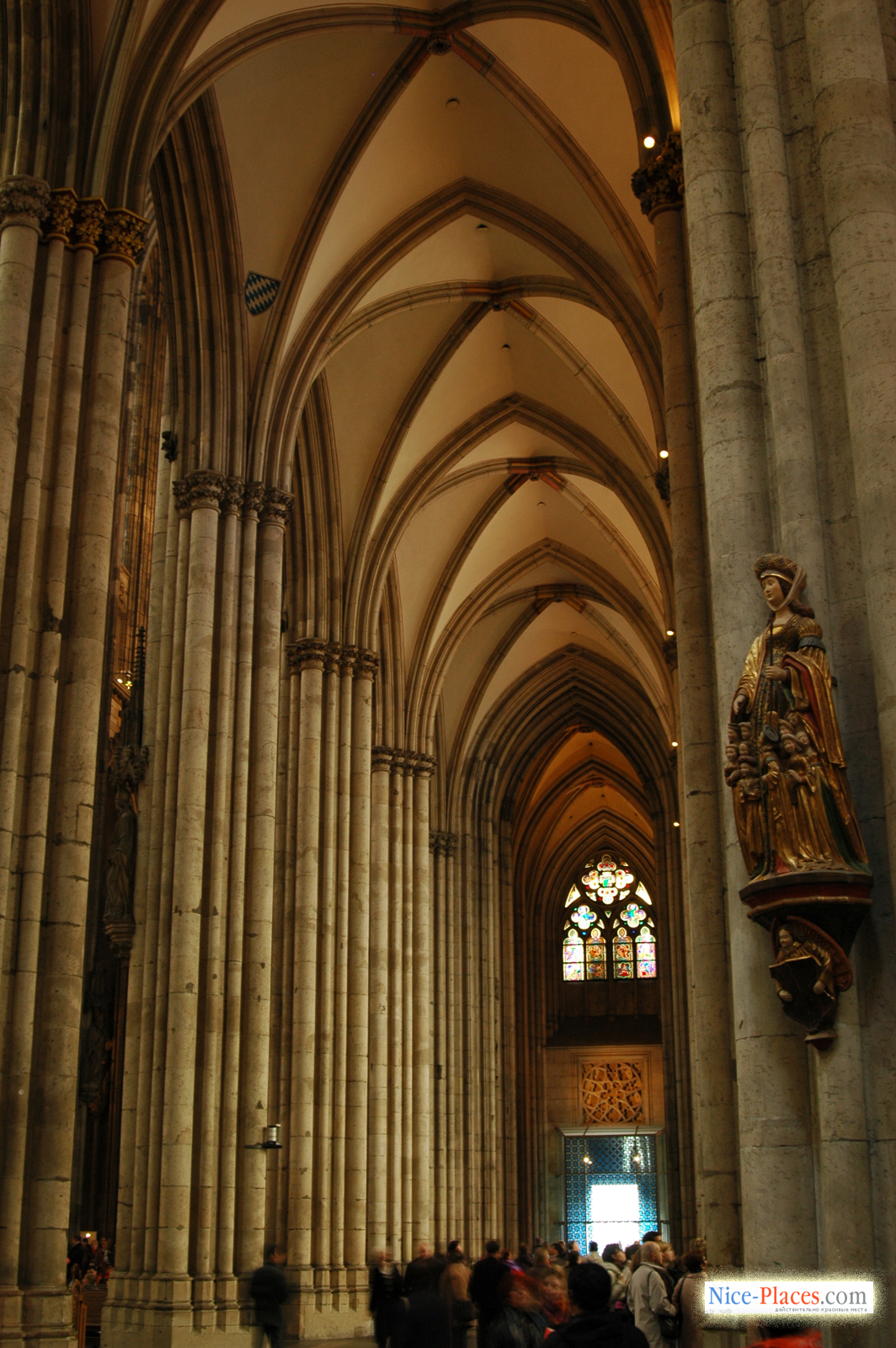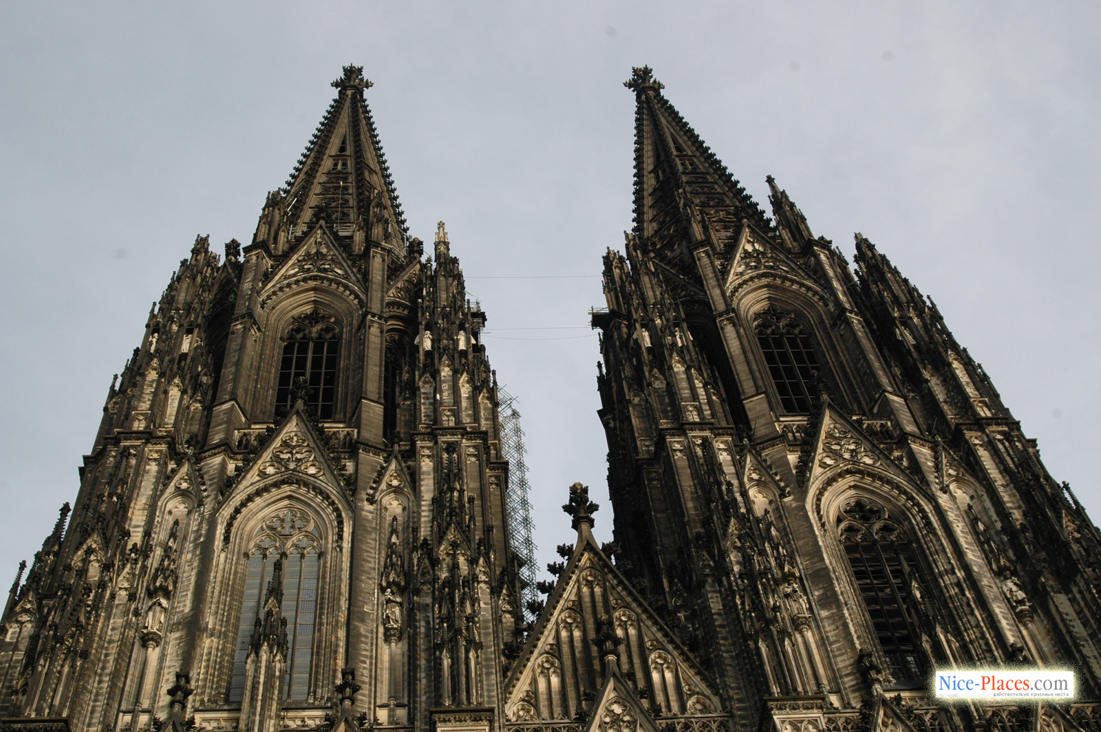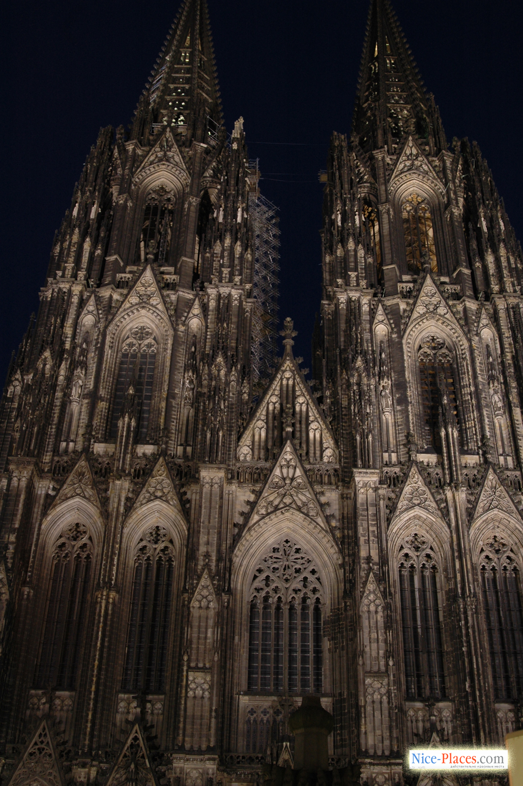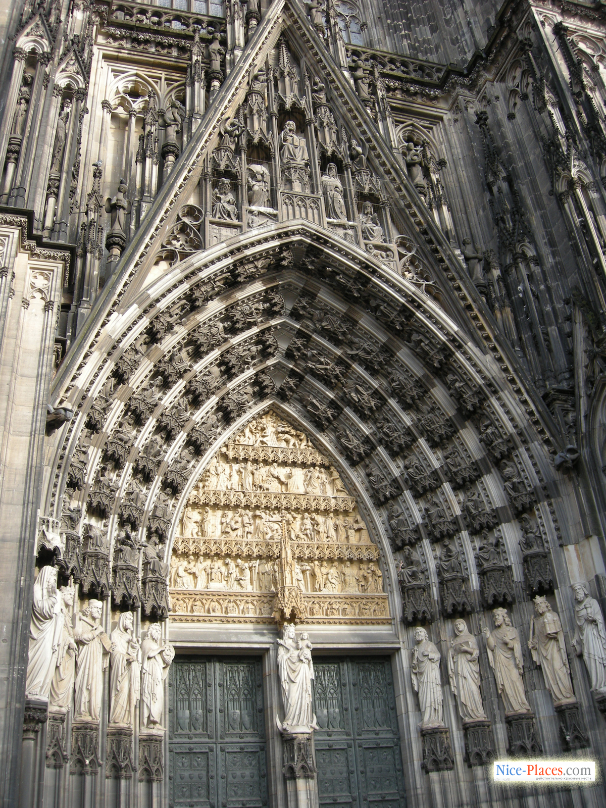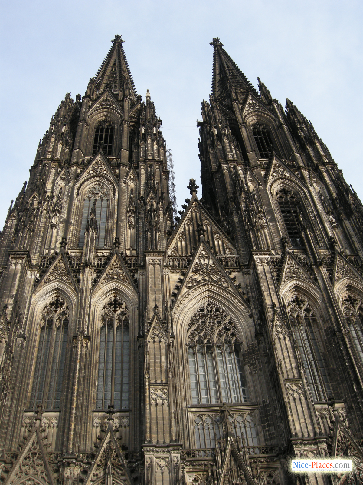 Рассматривая фасад архитектурного шедевра, поражаешься мастерству средневековых зодчих, сумевших гармонично совместить бесчисленное количество опорных пилястров и, словно невесомых, сквозных решеток, легких галерей и аркбутанов, фиалов и ажурных стрельчатых арок. Фасад Кельнского собора богато украшен уникальными скульптурами и декоративной резьбой, каждый ярус собора выглядит по-своему и при этом не вступает в противоречие с остальными. Чтобы прочувствовать величие и монументальность Собора Святых Петра и Марии, нужно войти внутрь храма и увидеть основной зал сакрального сооружения, окруженный многочисленными капеллами и часовнями, а 44-метровые колонны поддерживают звездчатые своды. Создается впечатление, что не только молится, но и мысли посетителей собора устремляются в небо, к Богу. Такое ощущение возникает не только благодаря грандиозности и высоте постройки, но и с помощью проекта здания – каждый неф уже предыдущего, средний неф в несколько раз выше боковых, выполняется игра света при помощи перепада высот, даже хор и нефы расположены на разных уровнях. Собор изнутри отделан рейнским камнем – им выложены свод, стены и даже потолок храма. Чтобы подняться на колокольни, расположенные в двух примыкающих по бокам башнях, нужно пройти по извилистым каменным винтовым лестницам, каждая из которых насчитывает 509 ступенек. А, используя колокольню как смотровую площадку, можно увидеть открывающуюся со стометровой высоты панораму города.