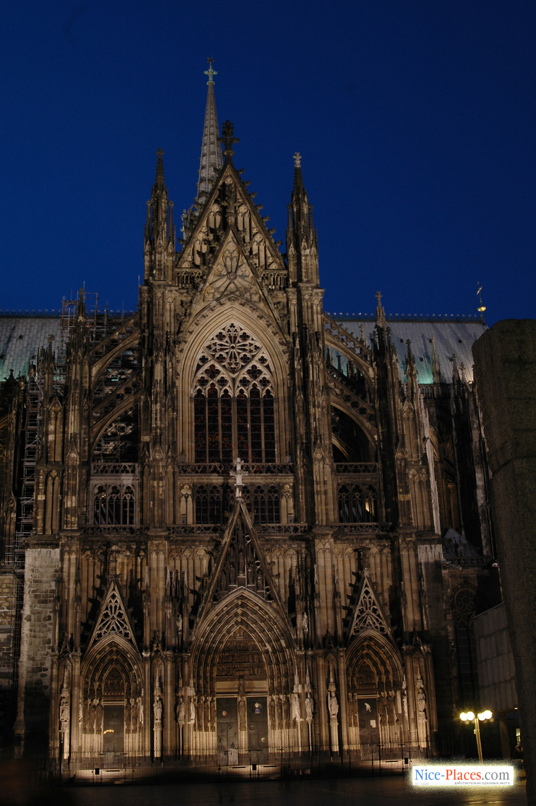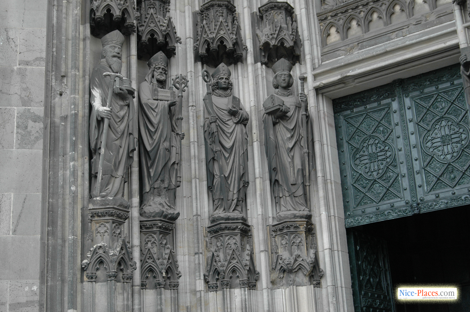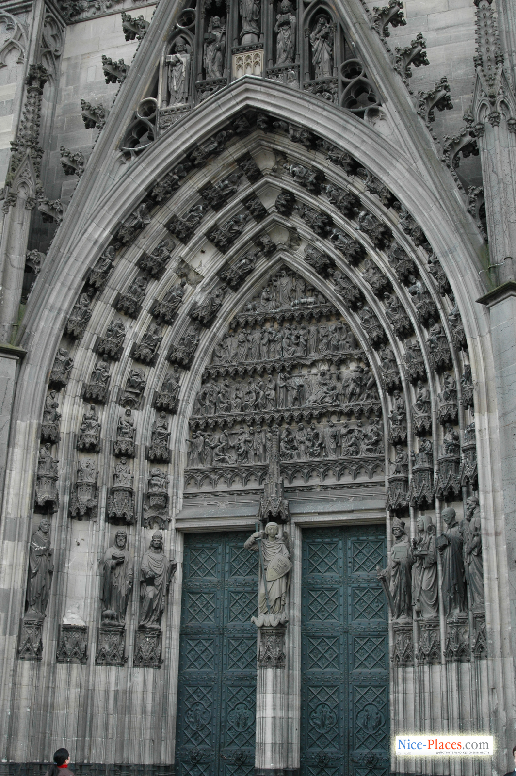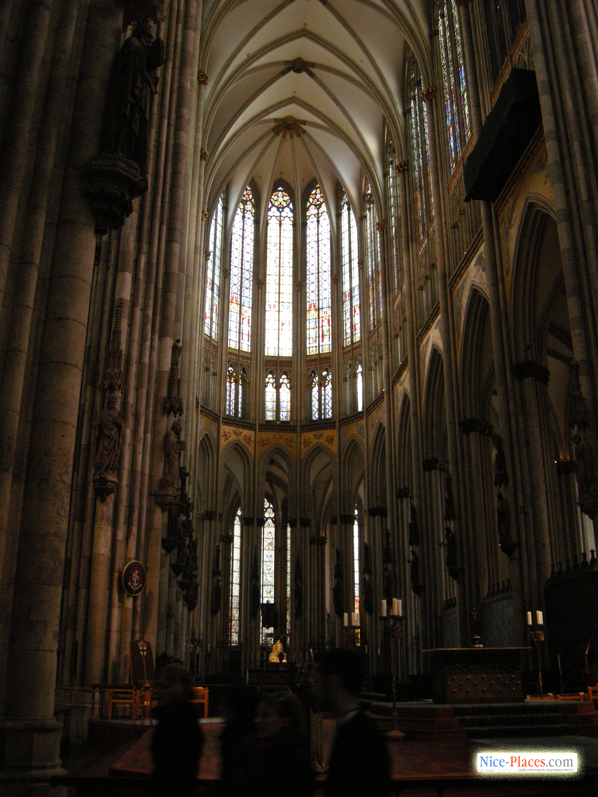 Рассматривая фасад архитектурного шедевра, поражаешься мастерству средневековых зодчих, сумевших гармонично совместить бесчисленное количество опорных пилястров и, словно невесомых, сквозных решеток, легких галерей и аркбутанов, фиалов и ажурных стрельчатых арок. Фасад Кельнского собора богато украшен уникальными скульптурами и декоративной резьбой, каждый ярус собора выглядит по-своему и при этом не вступает в противоречие с остальными. Чтобы прочувствовать величие и монументальность Собора Святых Петра и Марии, нужно войти внутрь храма и увидеть основной зал сакрального сооружения, окруженный многочисленными капеллами и часовнями, а 44-метровые колонны поддерживают звездчатые своды. Создается впечатление, что не только молится, но и мысли посетителей собора устремляются в небо, к Богу. Такое ощущение возникает не только благодаря грандиозности и высоте постройки, но и с помощью проекта здания – каждый неф уже предыдущего, средний неф в несколько раз выше боковых, выполняется игра света при помощи перепада высот, даже хор и нефы расположены на разных уровнях. Собор изнутри отделан рейнским камнем – им выложены свод, стены и даже потолок храма. Чтобы подняться на колокольни, расположенные в двух примыкающих по бокам башнях, нужно пройти по извилистым каменным винтовым лестницам, каждая из которых насчитывает 509 ступенек. А, используя колокольню как смотровую площадку, можно увидеть открывающуюся со стометровой высоты панораму города.
