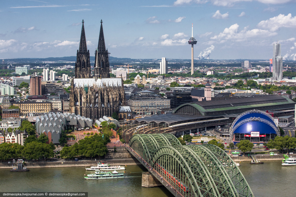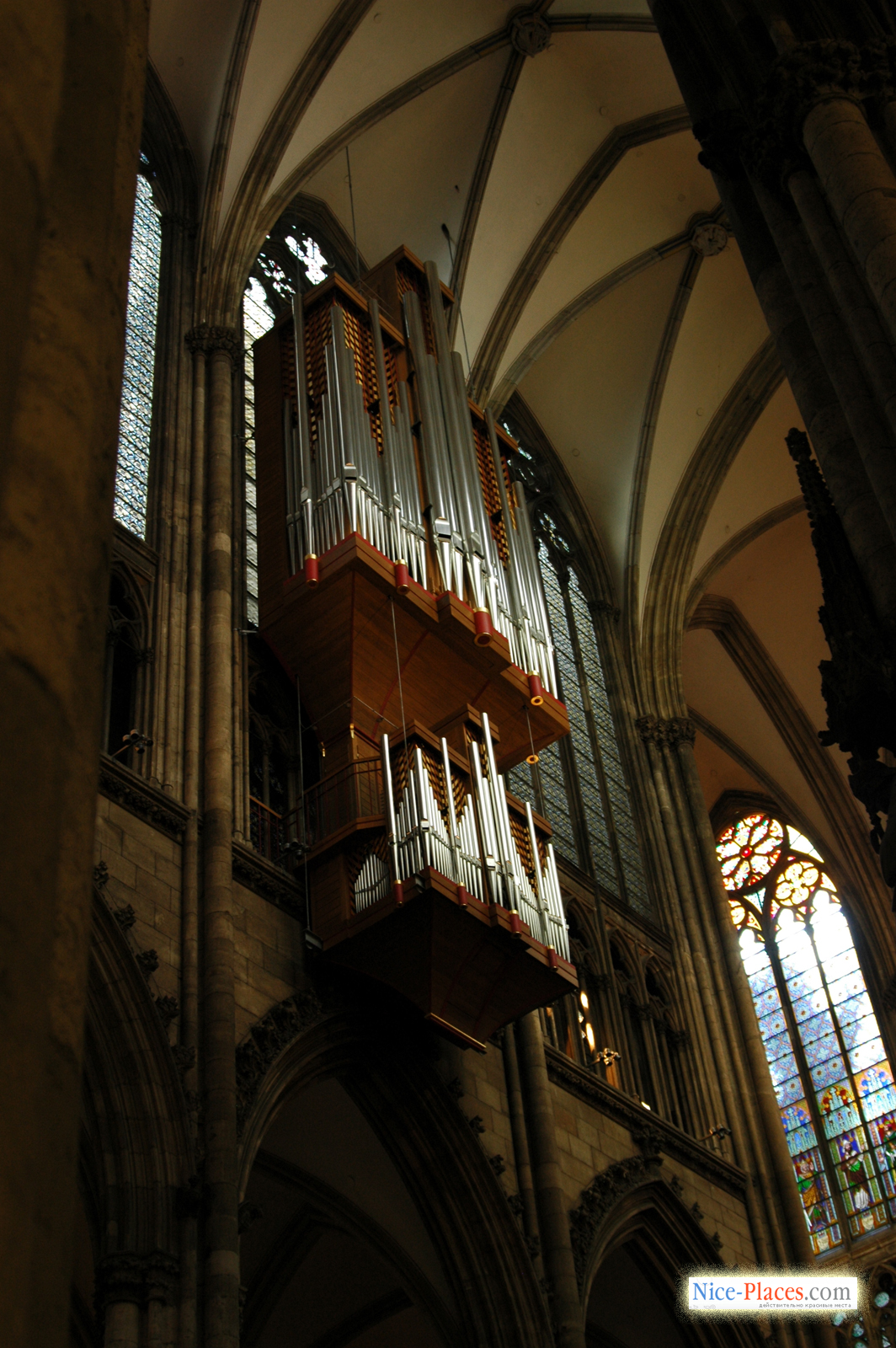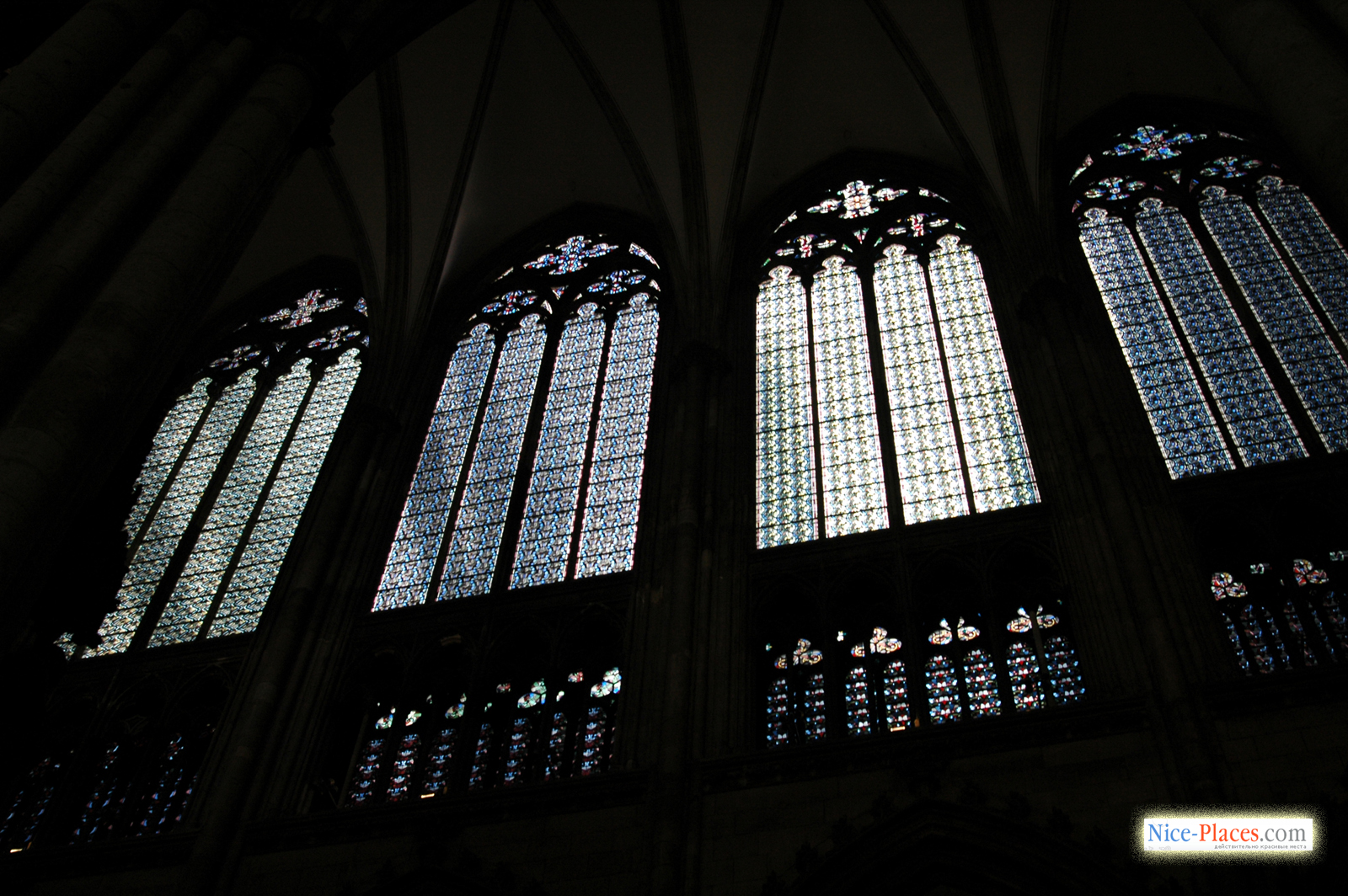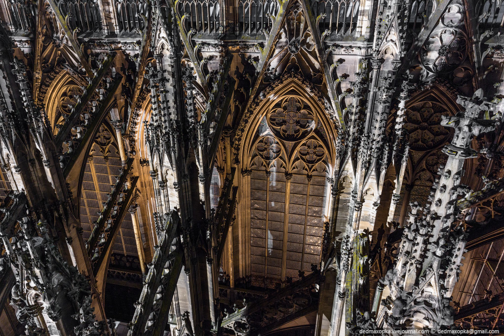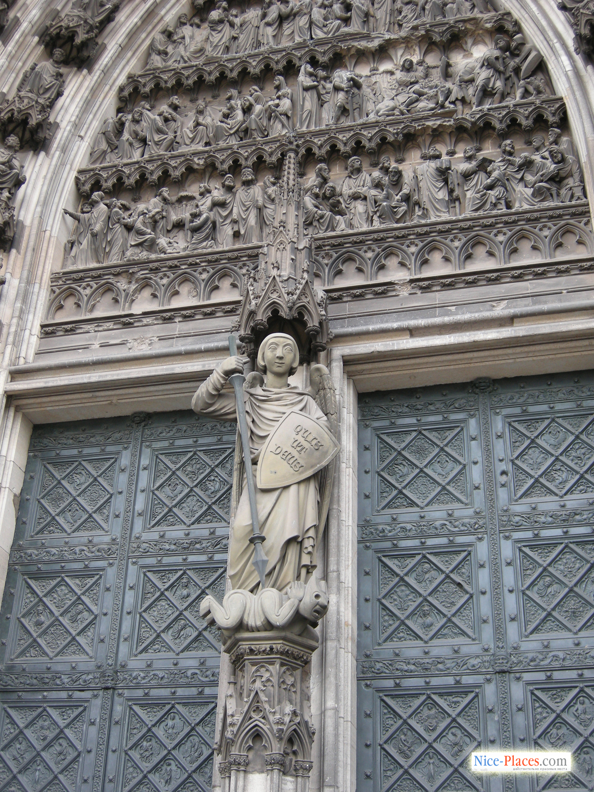 Рассматривая фасад архитектурного шедевра, поражаешься мастерству средневековых зодчих, сумевших гармонично совместить бесчисленное количество опорных пилястров и, словно невесомых, сквозных решеток, легких галерей и аркбутанов, фиалов и ажурных стрельчатых арок. Фасад Кельнского собора богато украшен уникальными скульптурами и декоративной резьбой, каждый ярус собора выглядит по-своему и при этом не вступает в противоречие с остальными. Чтобы прочувствовать величие и монументальность Собора Святых Петра и Марии, нужно войти внутрь храма и увидеть основной зал сакрального сооружения, окруженный многочисленными капеллами и часовнями, а 44-метровые колонны поддерживают звездчатые своды. Создается впечатление, что не только молится, но и мысли посетителей собора устремляются в небо, к Богу. Такое ощущение возникает не только благодаря грандиозности и высоте постройки, но и с помощью проекта здания – каждый неф уже предыдущего, средний неф в несколько раз выше боковых, выполняется игра света при помощи перепада высот, даже хор и нефы расположены на разных уровнях. Собор изнутри отделан рейнским камнем – им выложены свод, стены и даже потолок храма. Чтобы подняться на колокольни, расположенные в двух примыкающих по бокам башнях, нужно пройти по извилистым каменным винтовым лестницам, каждая из которых насчитывает 509 ступенек. А, используя колокольню как смотровую площадку, можно увидеть открывающуюся со стометровой высоты панораму города.