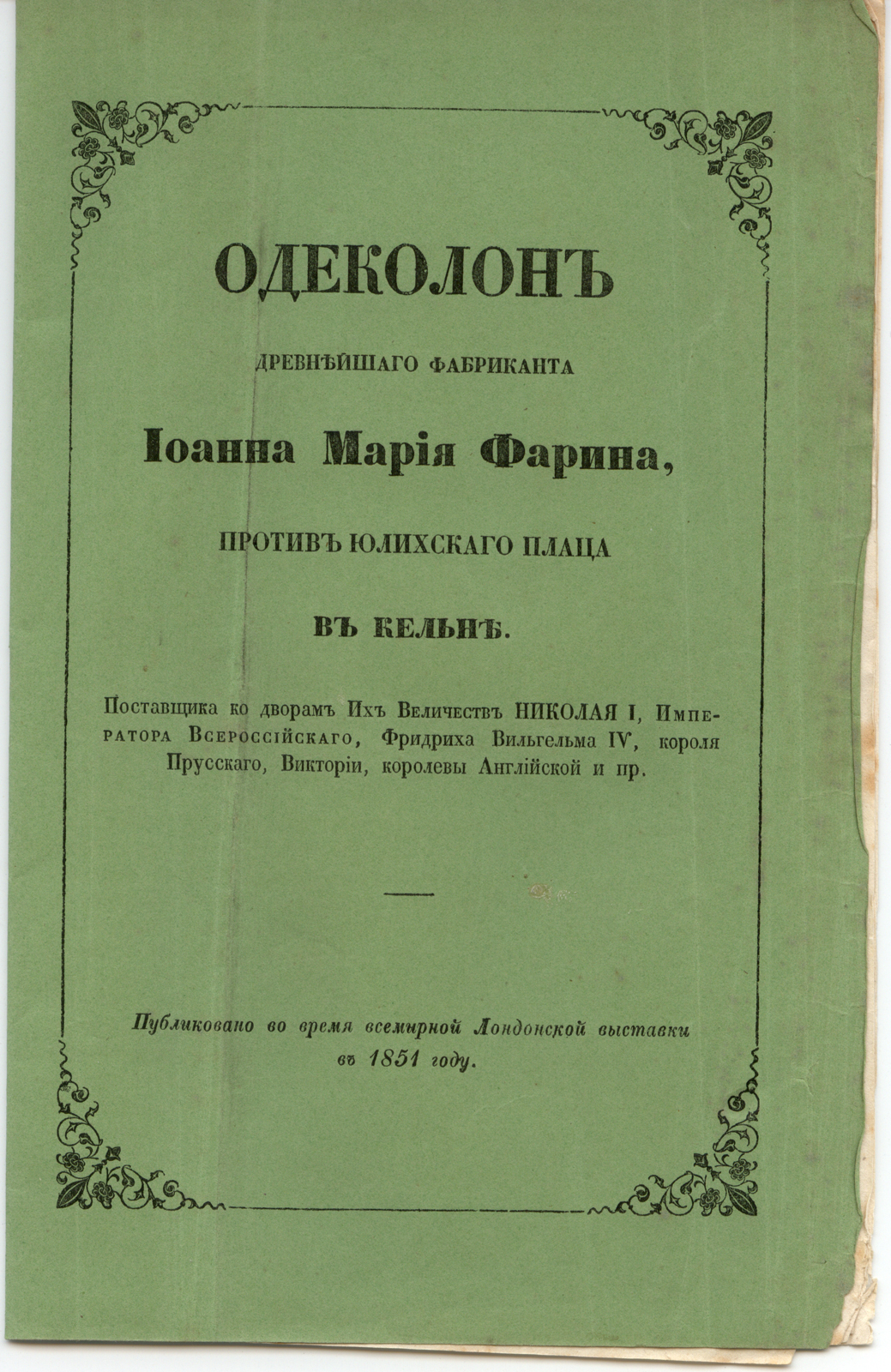 уру оригинального запаха вплоть до конца XIX века хранили в строжайшем секрете. После смерти изобретателя одеколона в 1766 году, секретом производства обладал только его племянник, который впоследствии передал тайну одеколона своим сыновьям. Широкой общественности формула стала доступна только в 1897 году, когда фабрика перешла по наследству к Иоганну-Марии Фарине. До этого конкуренты Фарины знали только отдельные моменты производства: например, что для получения спирта использовали виноград, привезенный из южной Франции, а готовую продукцию держали в специальных бочках, сделанных из кедра, которые не предавали одеколону посторонних ароматов.