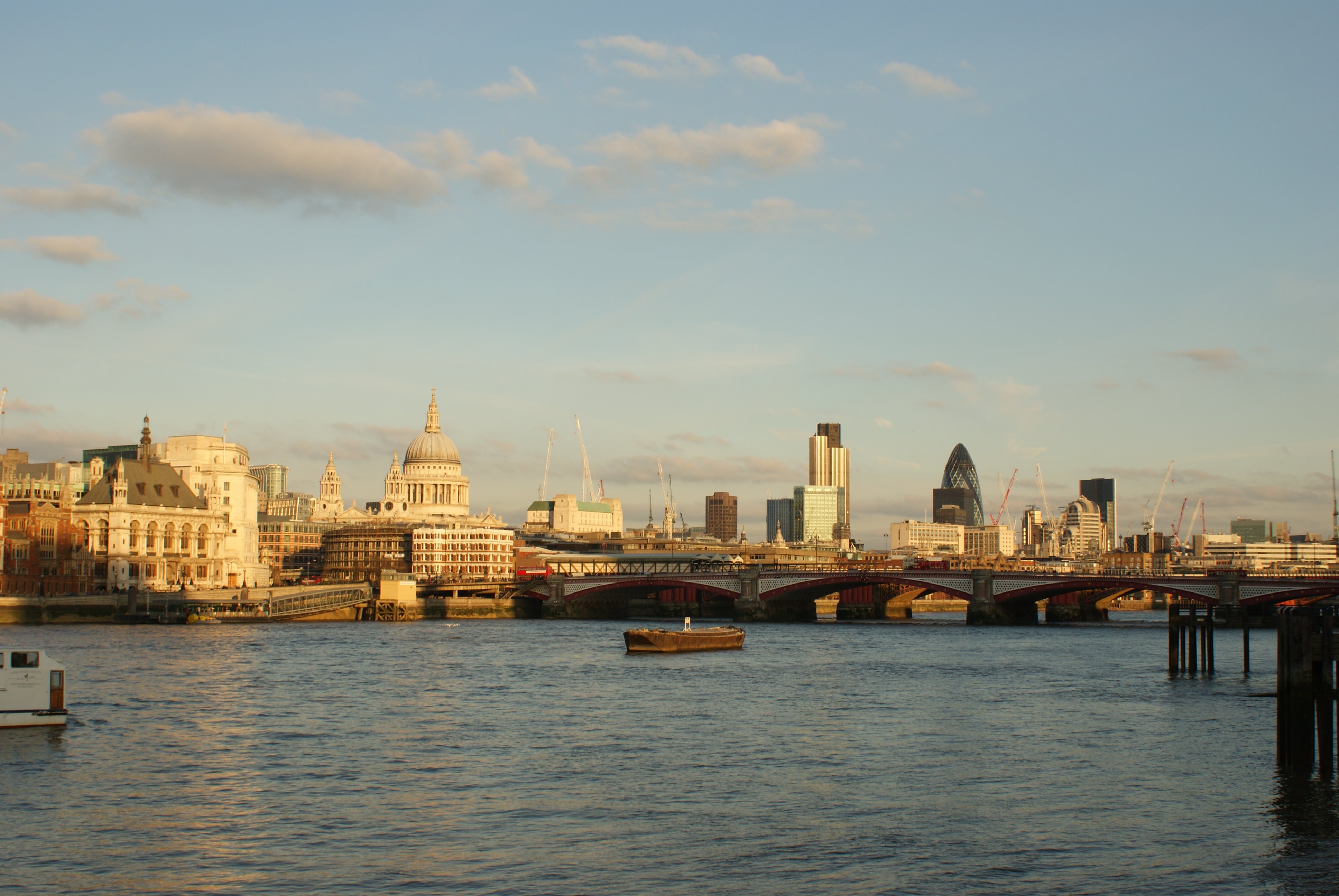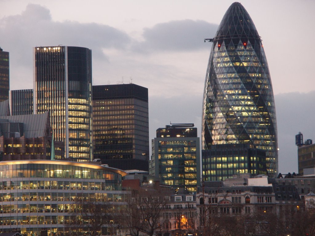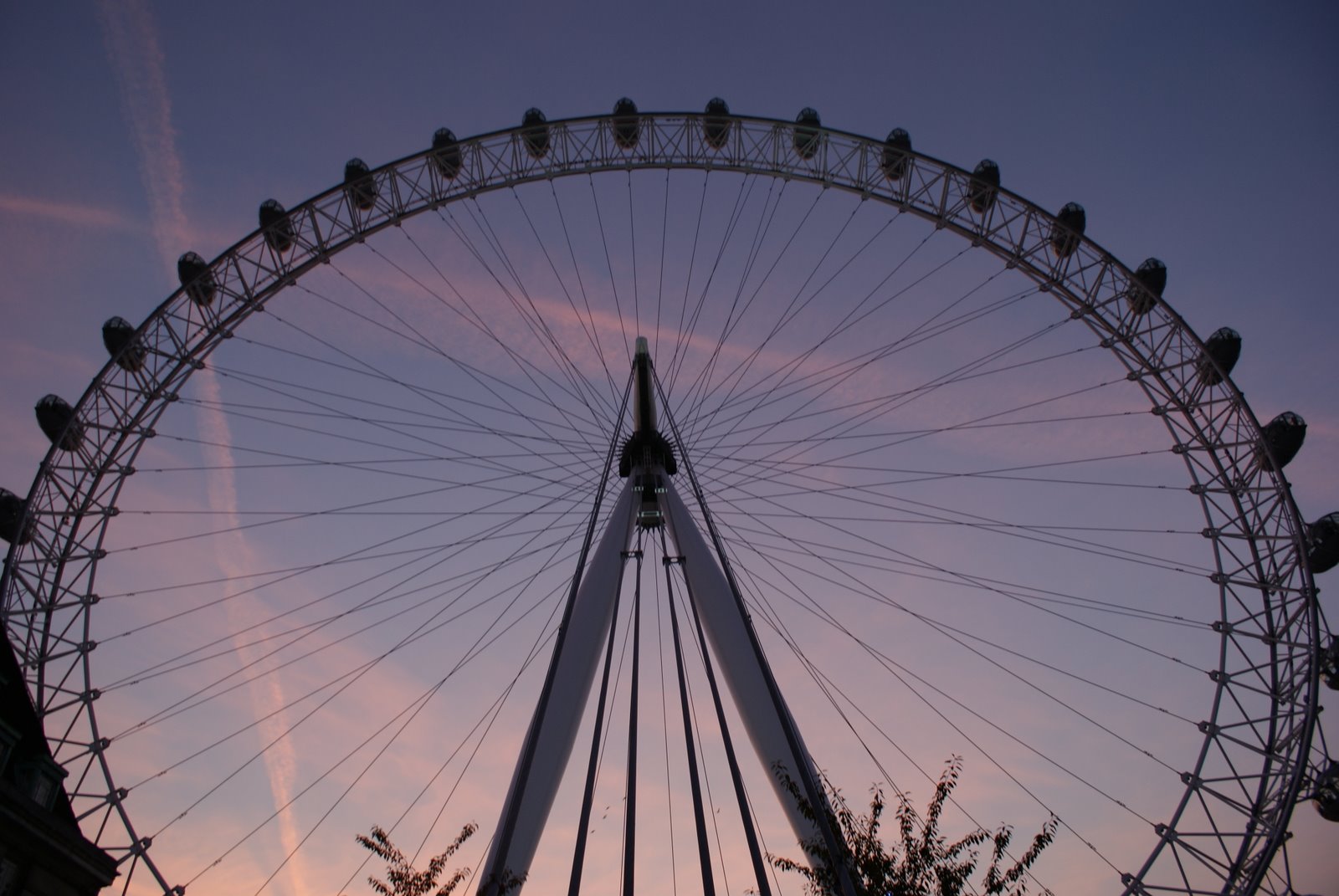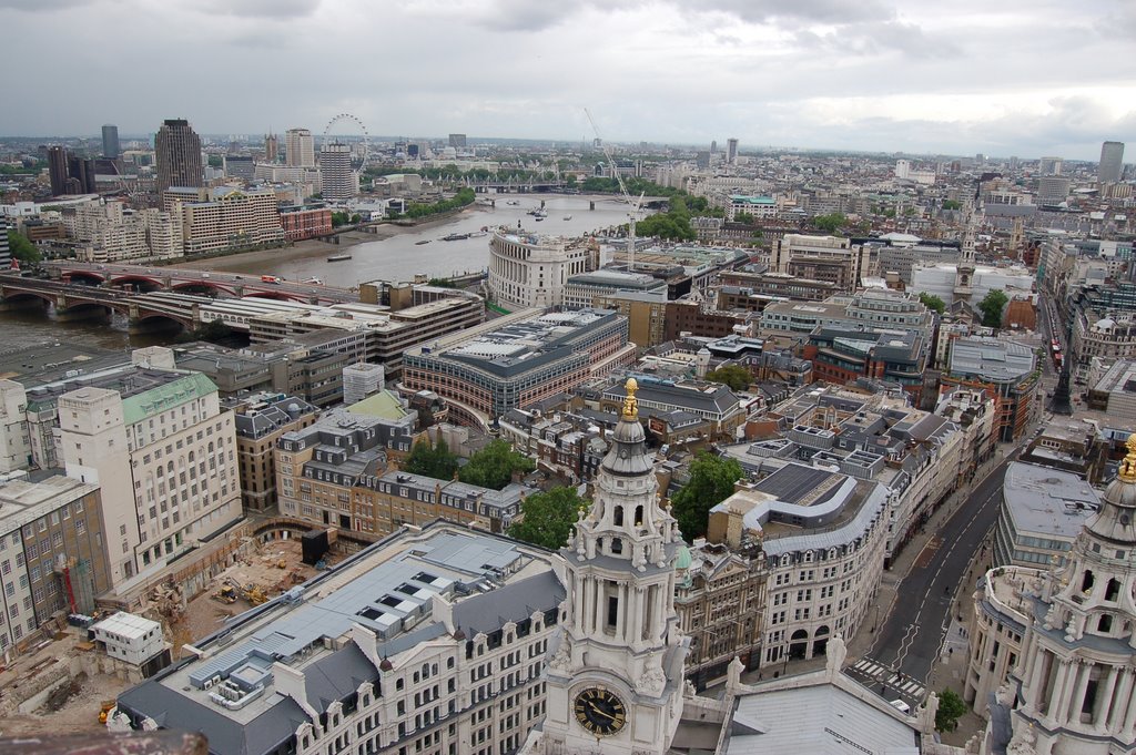 С высоты птичьего полёта, мы видим почти весь город! На юго-западе — Вестминстер, таящий в сумерках: и Биг-Бен с другими башнями дворца, и неовизантийский, в бело-красную полоску, Вестминстерский собор. На западе – парки, Букингемский дворец, правее угадывается Пикадилли и различима колонна Нельсона на Трафальгарской площади. Где-то, ещё дальше – район Сохо, знаменитый своими развлекательными заведениями, и музей восковых фигур Мадам Тюссо. На востоке – «здание из будущего» — похожая на парус мэрия Лондона, Сити-Холл. Неподалёку от мэрии – несколько небоскрёбов, построенных, как язвительрно говорят лондонцы, специально, чтобы создать привычную обстановку для финансистов. Среди них (небоскрёбов, а не финансистов) выделяется, «словно перст» – Мэри-Экс, любовно называемый «огурец». На южном берегу Темзы мы видим купол Миллениум (ровесник «колеса-глаза»), и соединяющую берега нитку пешеходного моста Миллениум, слева от которого – нет, это не вашингтонский Капитолий, это Собор святого Павла, а Капитолий построили по его «кальке».
