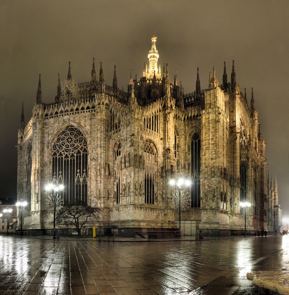 Большинство памятников архитектуры Милана сосредоточено вокруг старой площади Дуомо, находящейся в самом центре древнего города. Главным украшением площади является величественный собор, построенный в готическом стиле в XV-XVI веках. Этот шедевр сакрального зодчества принято называть Миланским собором, он является самым большим готическим храмов в мире, и занимает второе место по величине среди всех христианских храмов мира. Поражает не только необычная архитектура собора, но и его алтарь и витражи, здесь хранится и важная христианская реликвия – один из деревянных гвоздей, которым был прибит к кресту Иисус Христос во время распятия. На площади Дуомо находится Южный Дворец и Северный Дворец, построенные в ХХ столетии малые дворцы, роскошный Королевский дворец, храм Сан-Готтардо с высокой колокольней, сложенной из красного кирпича. На площади Дуомо находится и галерея, посвященная Витторио Эммануэлю и памятник ему перед входом в галерею. Во дворце Реале расположилось два музея – музей Миланского собора и музей Современного искусства.