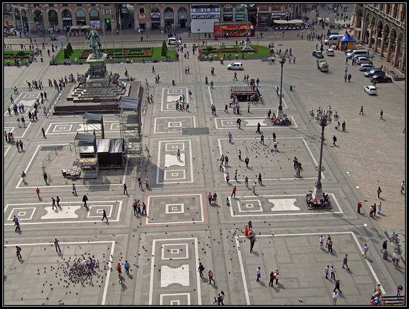 В плане застройки Милана, как и в плане застройки Москвы, использован радиально-кольцевой принцип: от центра к окраинам расходятся улицы, которые на своем пути пересекают бывшие границы города, обозначенные некогда крепостными стенами. В центре подобных городов как правило расположена площадь с Самым Главным Зданием на ней. В Милане роль подобного сооружения играет Дуомо (Duomo) – церковь, являющаяся вторым по величине христианским собором (а также крупнейшим в мире готическим храмом).
