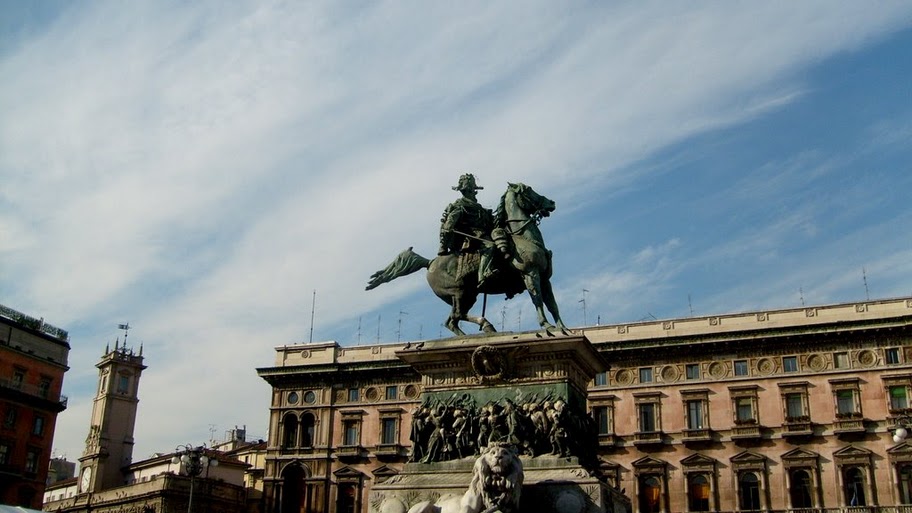 Центр площади украшает памятник королю Витторио-Эмануэле II, великому объединителю Италии, чье имя получил проспект и галерея. Статуя была отлита в 1896 г. скульптором Э.Роза, и примечательна она не столько вычурными барельефами, которые изображают триумфальное освобождение Милана пьемонтцами и французами от ненавистных австрийцев, сколько поразительной чистотой. Многочисленные голуби изрядно портят жизнь городским коммунальным службам, покрывая практически сплошным слоем и собор, и всю площадь, но, как ни странно, ни король, ни его конь никогда не становятся предметом посягательства надоедливых птиц. Как оказалось, дело не в искреннем уважении пернатых к национальному герою, просто через статую пропущен электрический ток небольшой силы, он то и отпугивает голубей.