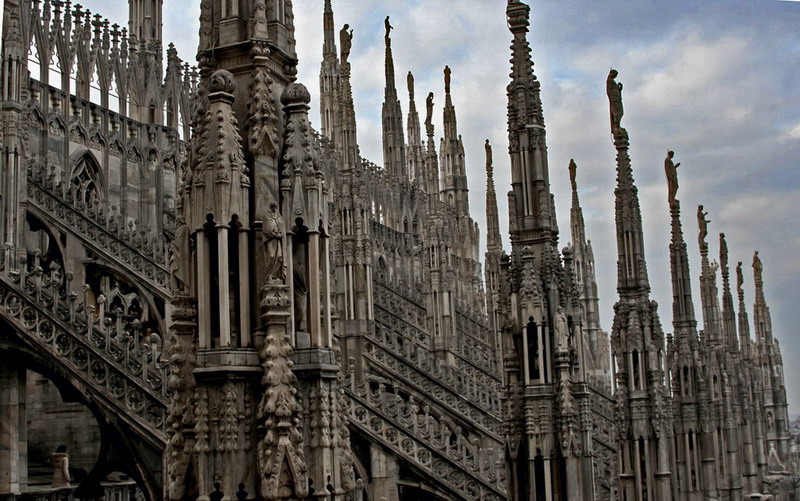 Миланский кафедральный собор так и провоцирует, чтобы его одаривали разнообразными эпитетами: ошеломляющий, грандиозный, великолепный… Не менее впечатляющим выглядит и срок, который потребовался для возведения столь прекрасного храма. А строили Дуомо на протяжении шести столетий. Началось все весной 1386 г., когда архиепископ ди Салуццо заложил первый камень. Для строительства использовался не красный обожженный кирпич, который традиционно применялся в Милане, а дорогой кандолийский мрамор. Карьеры по добыче этого ценного материала находились у озера Лаго-Маджоре, для доставки его на стройплощадку были прорыты специальные каналы. Владельцем карьеров был герцог Джан-Галеаццо Висконти, который ради такого благого дела решил предоставить мрамор бесплатно, как следствие, строительные рабочие также получили предложение отказаться от гонорара. Грузы, предназначавшиеся для храма, маркировались отметкой "A.U.F." , расшифровывалась аббревиатура как "ad usum fabricae" — "для строительства", благодаря этим трем буквам товары освобождались от любых пошлин. С той поры в Миланском лексиконе появилась фраза "a ufo", обозначающая что-либо бесплатное.