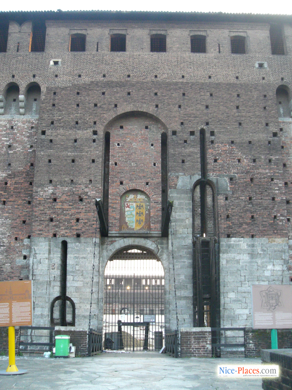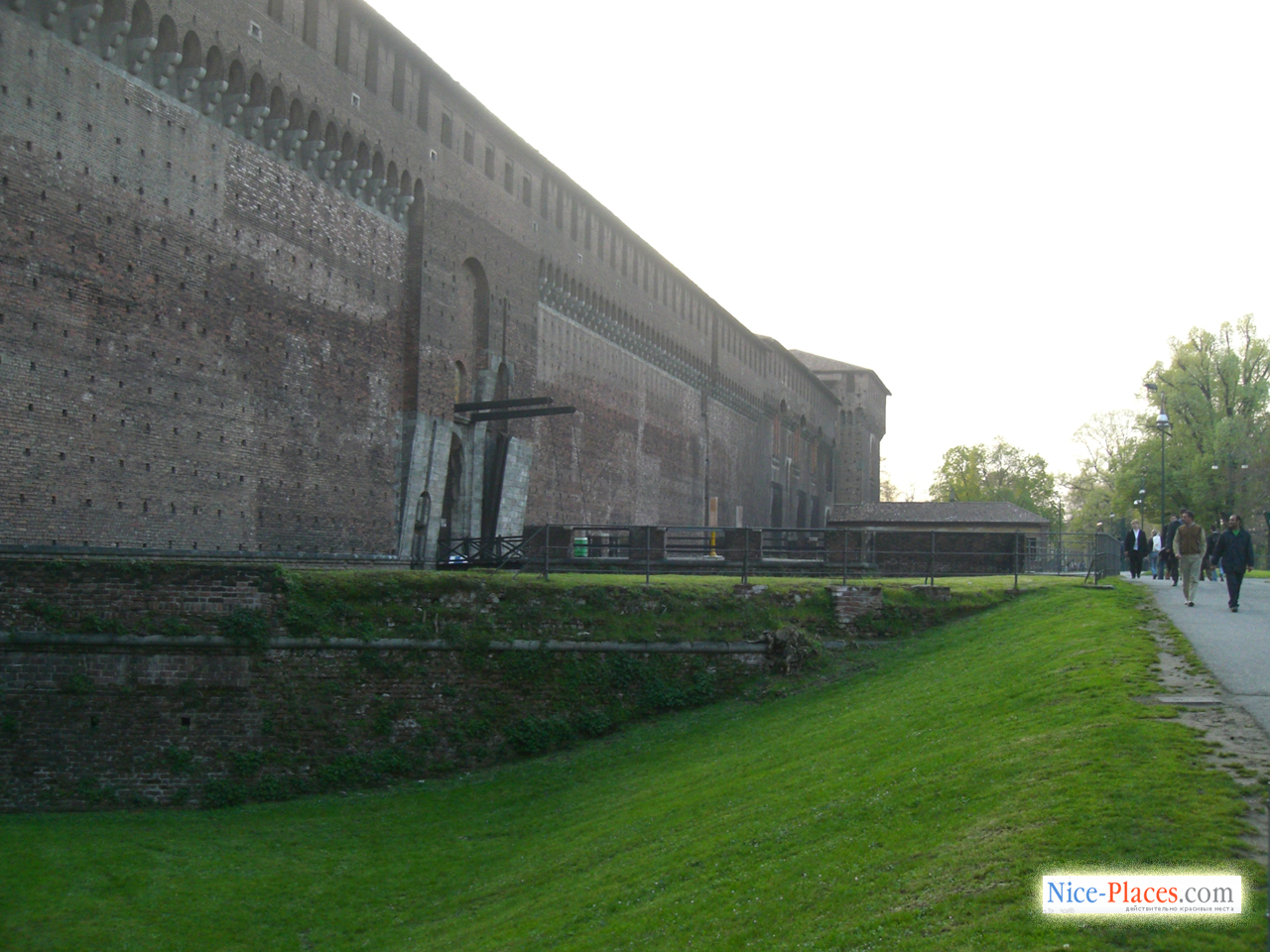 Сфорца принял решение провести реконструкцию замка, принадлежащего его предшественникам. Первым делом были сооружены массивные стены, на четырех углах которых построили оборонительные башни. В середине XV века к стене, обращенной в сторону города, пристроили еще одна башня, автором ее стал архитектор Филарете. Правда, в XVI веке она была уничтожена, восстановлением начали заниматься лишь в конце позапрошлого столетия.