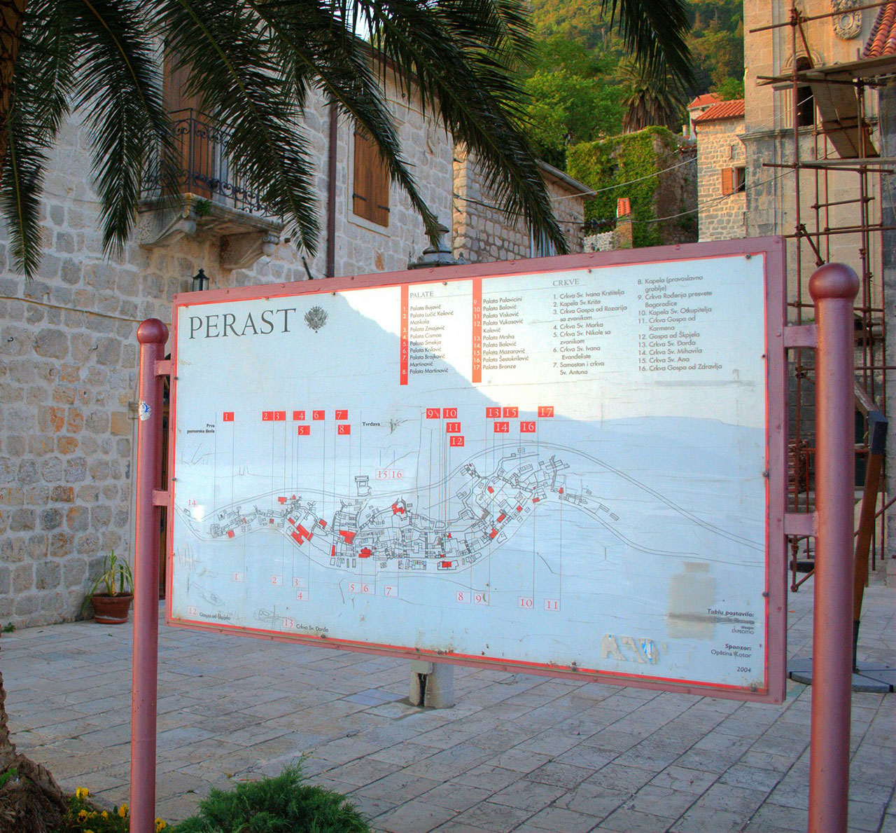 Один из самых знаменитых черногорских курортов, Пераст расположен на берегу залива Рисан. Город узкими улочками, обилием красных крыш и аккуратными домиками напоминает другие населенные пункты Адриатики и в то же самое время имеет свой неповторимый облик. Перастом несколько столетий владели венецианцы, которые и повлияли на его архитектурный вид. Город славится роскошными дворцами, уютными виллами, самобытными церквями. Доминантой Пераста считается крепость Святого Креста, расположенная на высоком холме над Бока-Которской бухтой. Также описание города было бы неполным без упоминания двух островков, которые находятся прямо напротив исторического центра Пераста.